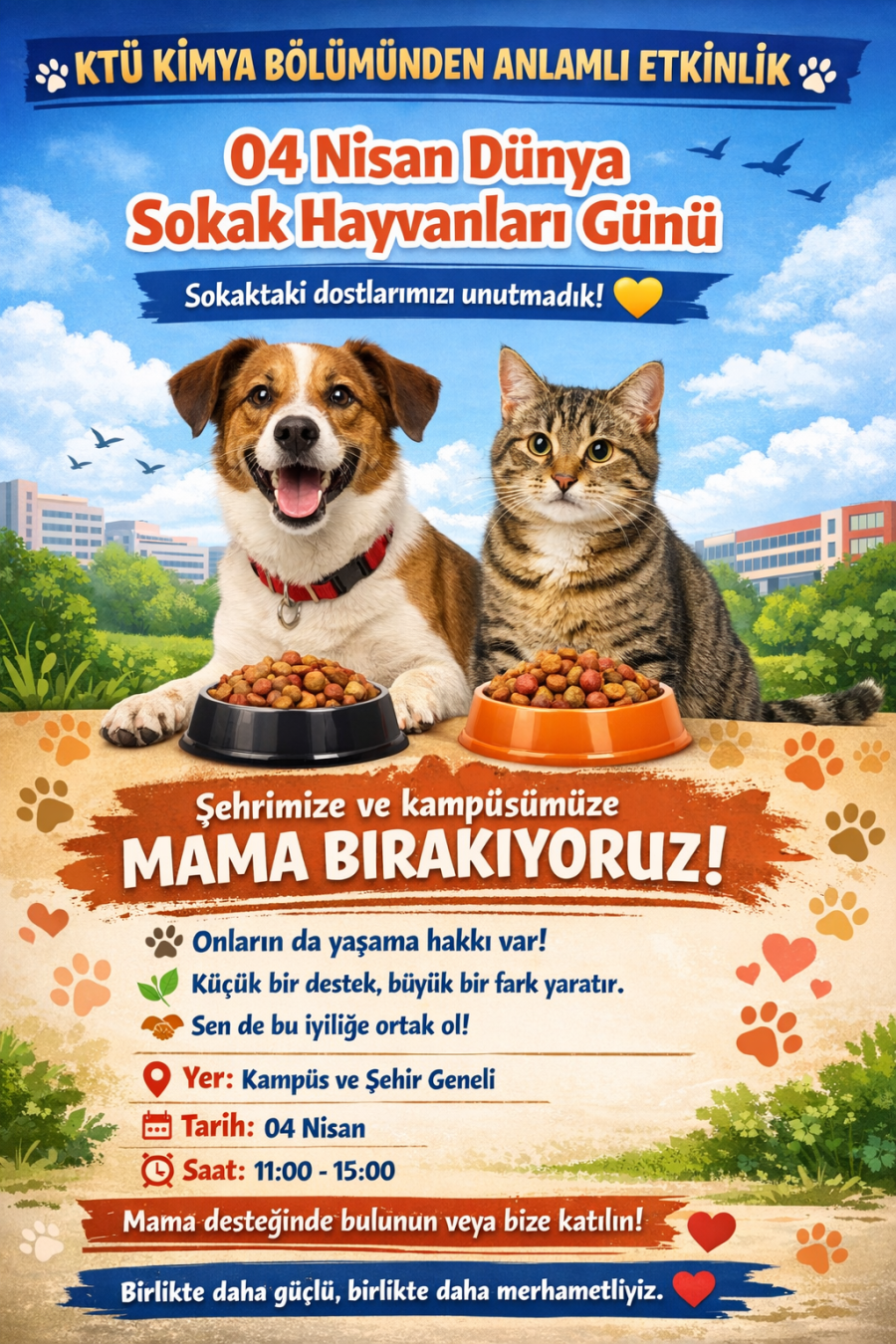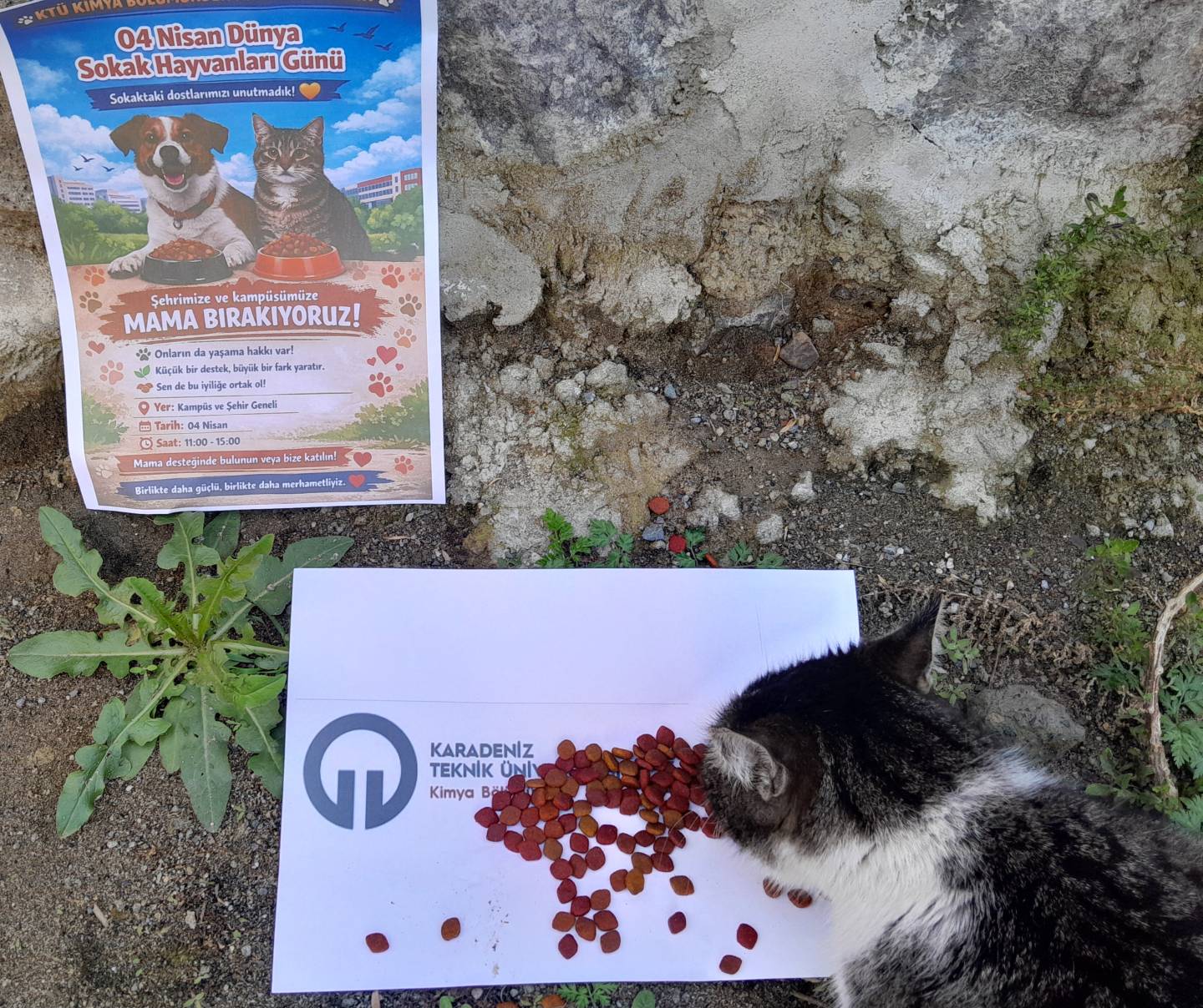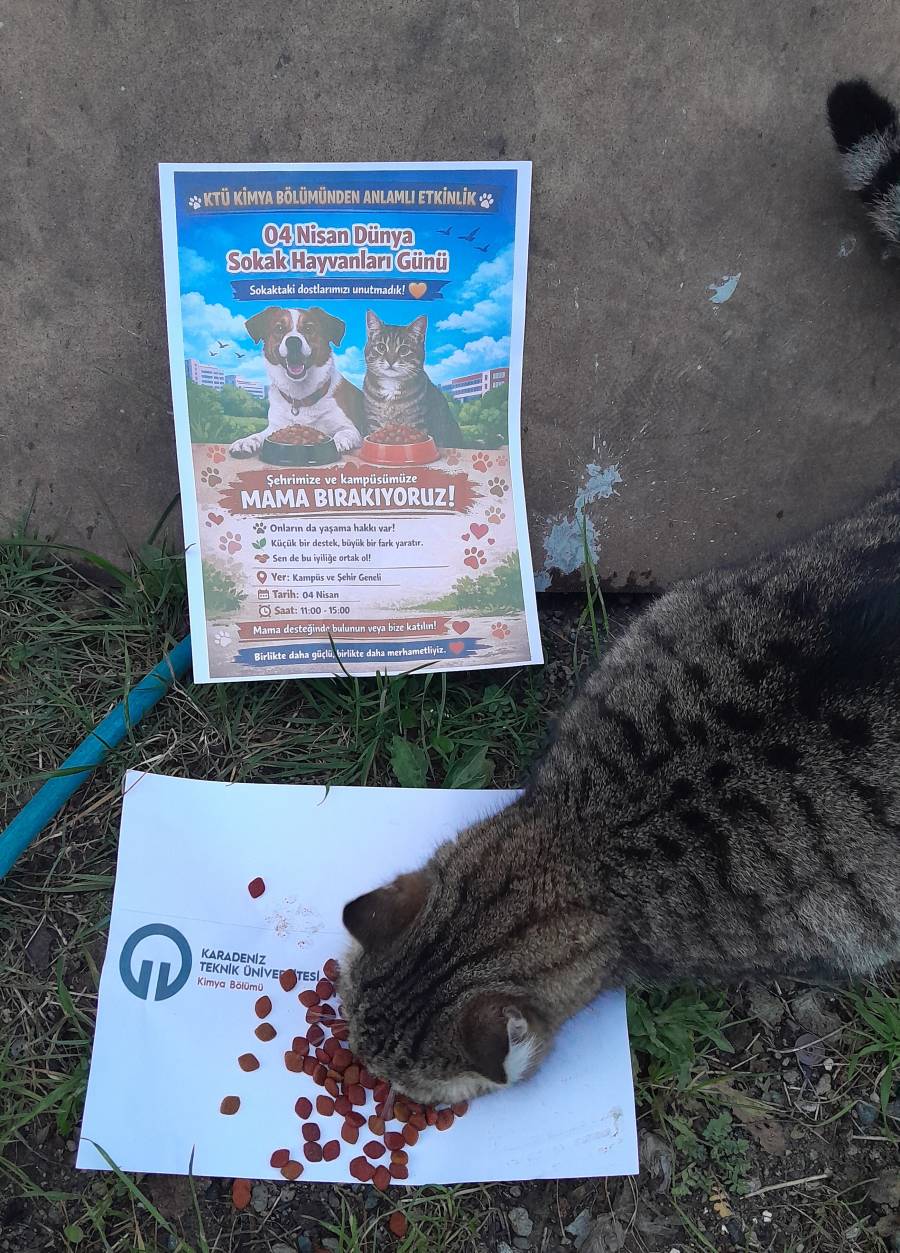 "Sürdürülebilir kalkınma hedeflerine yönelik yıl içerisinde düzenlenen etkinlik sayısı (Karasal Yaşam)" kapsamında Karadeniz Teknik Üniversitesi Kimya Bölümü Ailesi olarak, 04 Nisan Dünya Sokak Hayvanları Günü kapsamında anlamlı bir sosyal sorumluluk etkinliği gerçekleştirdik. Sokak hayvanlarının yaşam koşullarına dikkat çekmek ve onların beslenmesine katkı sağlamak amacıyla kampüsümüz ve şehir genelinde mama dağıtımı yaptık.