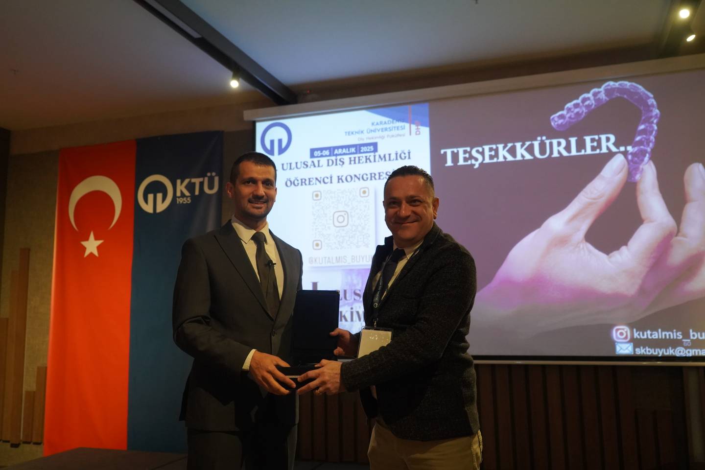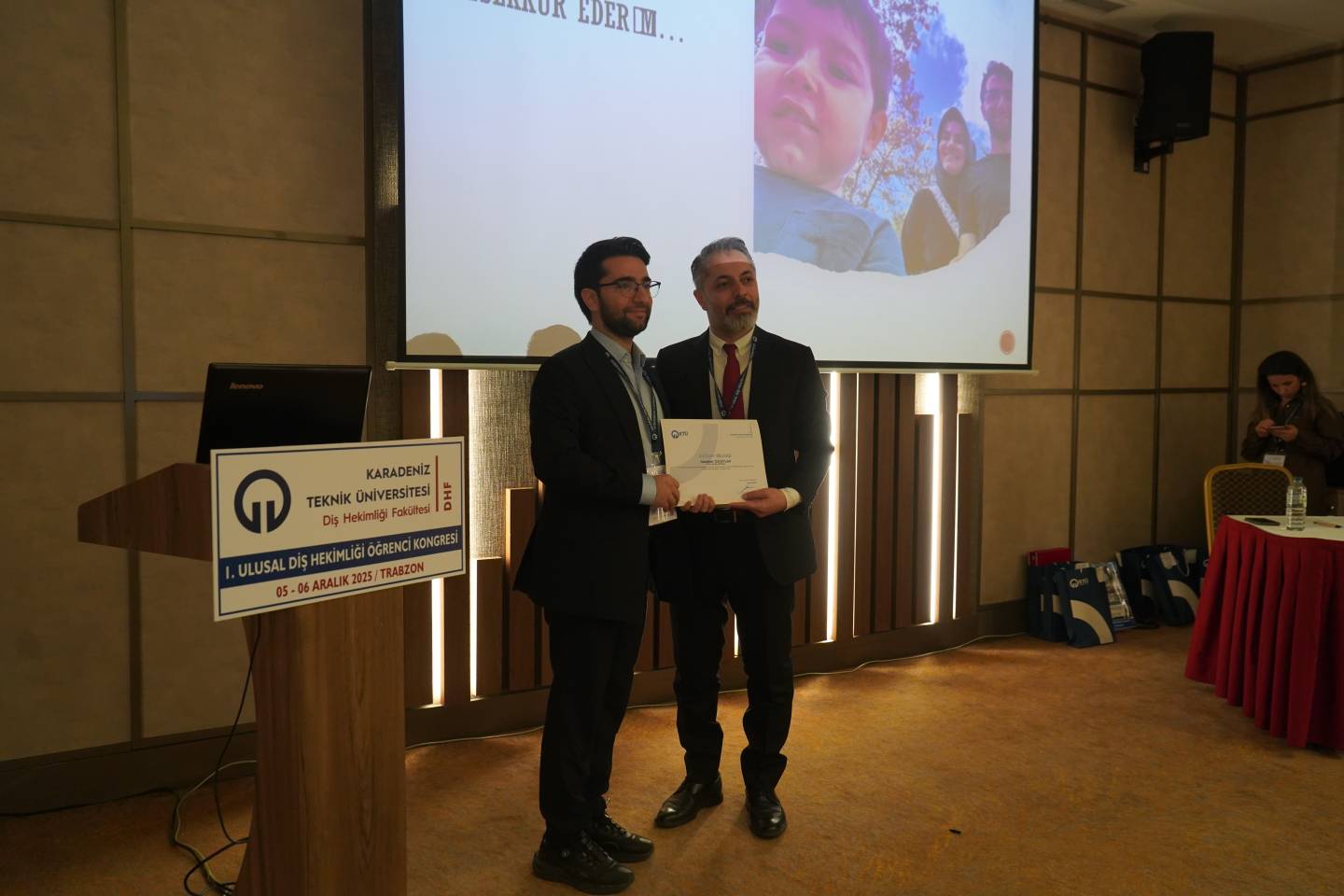 Belge takdim töreni, kongre başkanı ve Fakültemiz Klinik Bilimleri Bölümü Ağız, Diş ve Çene Cerrahisi Anabilim Dalı öğretim üyesi Doç. Dr. Efe Can Sivrikaya tarafından gerçekleştirildi. Doç. Dr. Sivrikaya, öğrencileri özverili çalışmaları ve etkinliğin düzenlenmesine sağladıkları destek nedeniyle tebrik ederek, akademik ve mesleki gelişimlerine katkı sunan bu tür organizasyonlarda aktif rol almanın önemini vurguladı.