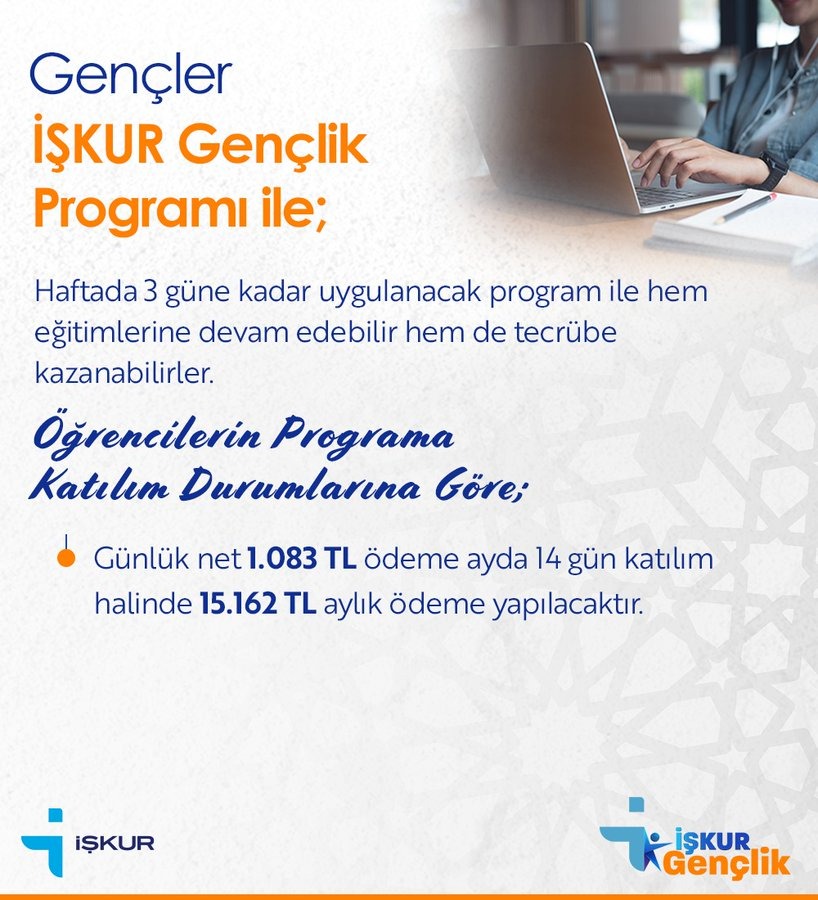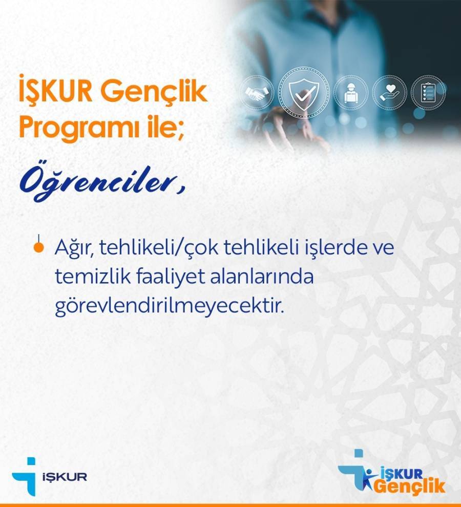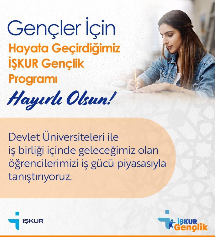 Türkiye İş Kurumu (İŞKUR), devlet üniversiteleriyle (Yüklenici) birlikte başlattığı İŞKUR Gençlik Programı; katılımcı (öğrencilerin) istihdam edilebilirliğini artırmak ve aynı zamanda bilgi, beceri, çalışma alışkanlığı ve disiplin kazandırmaktır. Katılımcılar, program kapsamında hem iş gücü deneyimi edinecek hem de maddi destek alma fırsatı bulacaktır. İŞKUR GENÇLİK PROGRAMININ YÜRÜTÜLMESİNE İLİŞKİN USUL VE ESASLAR HAKKINDA GENELGE İÇİN TIKLAYINIZ.