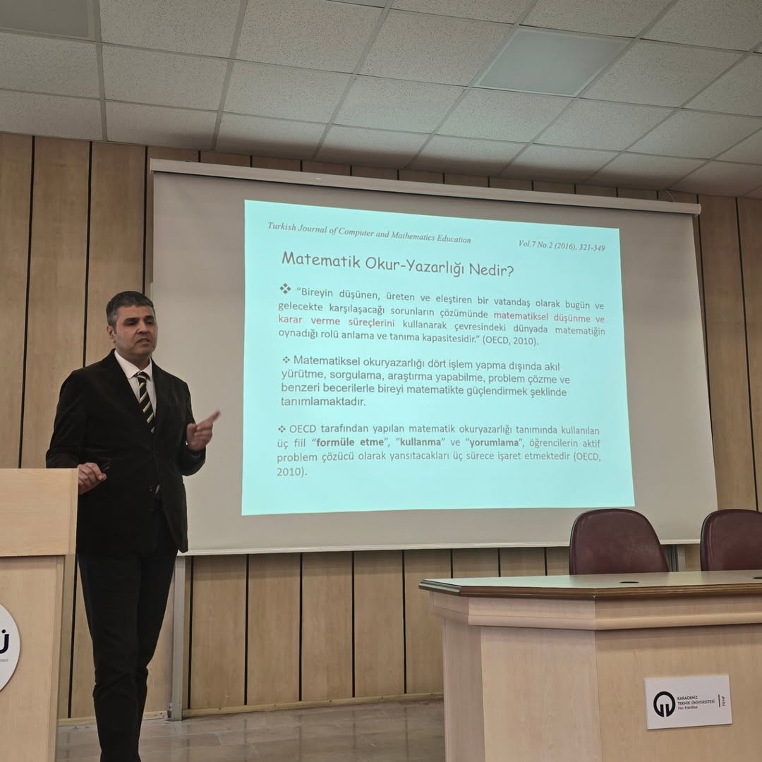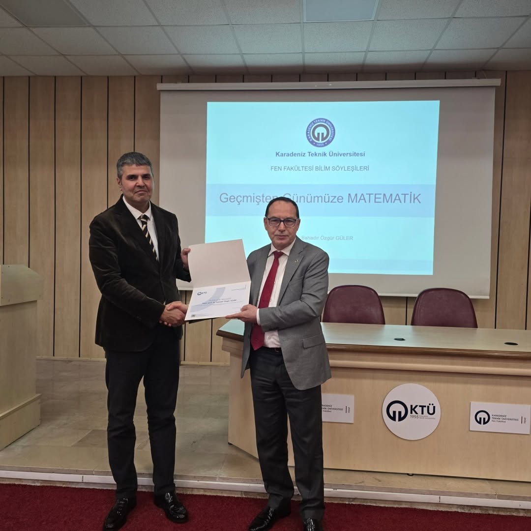 Fen Fakültesi Bilim Söyleşileri serisine, bölümümüz öğretim üyelerinden Prof. Dr. Bahadır Özgür Güler, “Geçmişten Günümüze Matematik” başlıklı söyleşisiyle misafir konuşmacı olarak katılmıştır. 10 Nisan 2026 tarihinde saat 14.00’te Fakültemiz Nazım Terzioğlu Amfisi’nde gerçekleştirilen söyleşide, matematiğin tarihsel gelişim süreci ve günümüze uzanan yolculuğu ele alınmış; alanın önemli dönüm noktaları, düşünsel arka planı ve günümüz bilim dünyasındaki yeri kapsamlı bir şekilde katılımcılarla paylaşılmıştır.