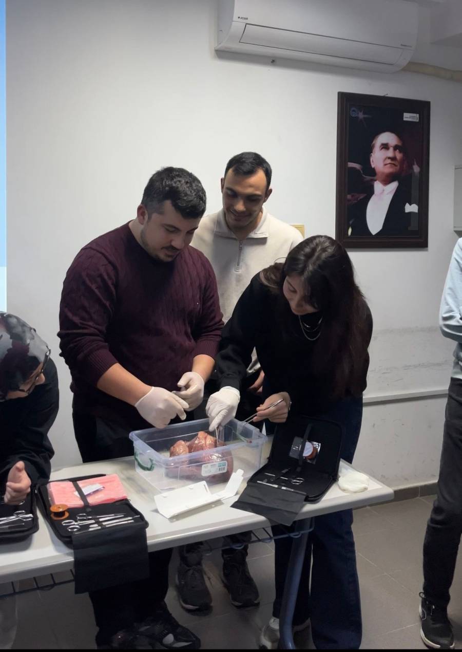 Etkinliğin uygulamalı bölümünde ise, koyun kalbi üzerinde diseksiyon gerçekleştirilmiş; kalbin yapısı, damar ilişkileri ve cerrahi anatomi katılımcılarla detaylı olarak incelendi. Bu uygulama, öğrencilerin teorik bilgilerini pratiğe dökebilecekleri verimli bir ortam sağladı.