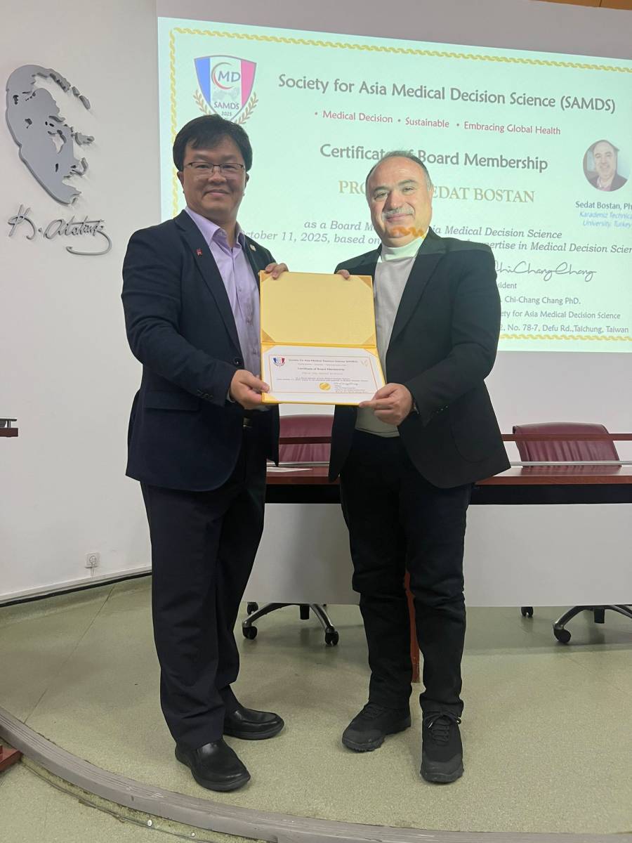 Dış İlişkiler Genel Koordinatörlüğü, Sağlık Bilimleri Enstitüsü ve Fakültemizin ortak organizasyonuyla, 30 Ekim 2025 tarihinde Fakültemiz Aydın İnal Amfisi'nde, Tayvan'da bulunan Chung Shan Sağlık Bilimleri Üniversitesi öğretim üyesi ve aynı zamanda Asya Tıbbi Teşhis Bilimi Topluluğu başkanlığını da yürütmekte olan Prof. Dr. Chi-Chang Chang tarafından "Yeni Nesil Sağlık Hizmeti Sunumu için Yapay Zeka Destekli Tıbbi Teşhis Bilimi" konulu seminer düzenlendi. Seminer bitiminde Prof. Dr. Chi-Chang Chang'a Dekanımız Prof. Dr. Sevdegül AYDIN MUNGAN tarafından plaket takdim edildi ve Sağlık Bilimleri Enstitüsü Müdürü Prof. Dr. Sedat BOSTAN tarafından katılım sertifikası verildi. Etkinliğe Dış İlişkiler Genel Koordinatörü Prof. Dr. Sercan EROL ve Değişim Programları Koordinatörüğü ekibinden Öğr. Gör. Zehra ŞAHİN BEKTAŞ da katılım sağladılar.
