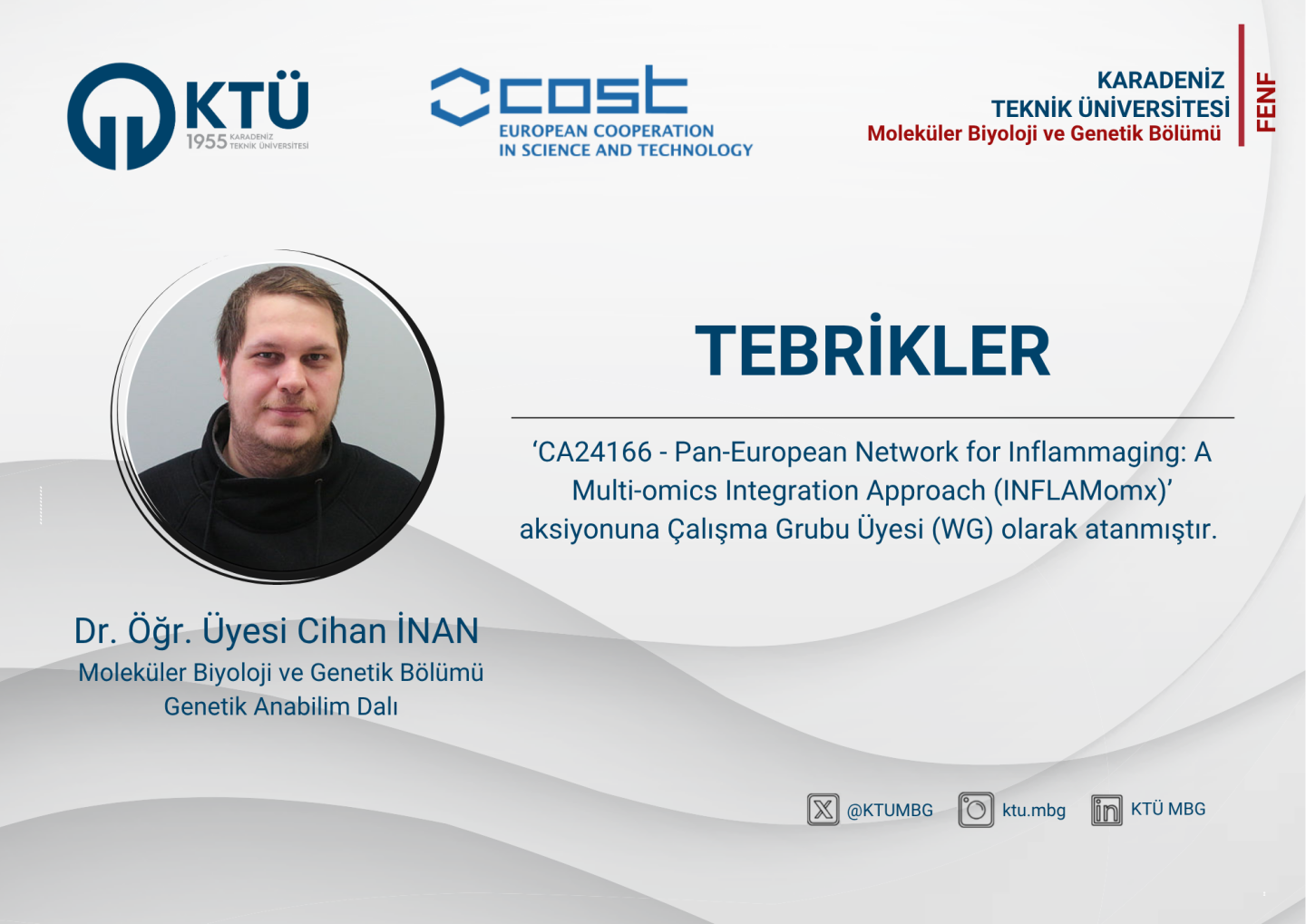Bölümümüz öğretim üyelerinden Dr. Öğr. Üyesi Cihan İnan ‘CA24166 - Pan-European Network for Inflammaging: A Multi-omics Integration Approach (INFLAMomx)’ aksiyonuna Çalışma Grubu Üyesi (WG) olarak atanmıştır.