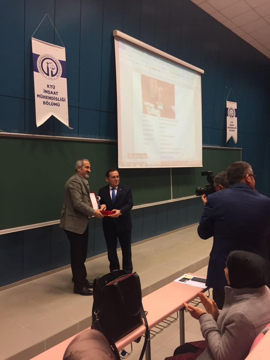 Trabzon Ticaret ve Sanayi Odası Yönetim Kurulu Başkanı Mustafa Suat HACISALİHOĞLU (Mak.Müh..) Girişimcilik Dersi Kapsamında İnşaat Mühendisliği Bölümünde 19 Aralık 2017 Salı günü saat 17:00-18:00' da Prof.Naci YÜNGÜL Amfisinde bir konferans vermiştir. Konferans bitiminde Mühendislik Fakültesi Dekanı Prof.Dr. Metin HÜSEM, M. Suat HACISALİHOĞLU'na katkılarından dolayı plaket takdim etmiştir.