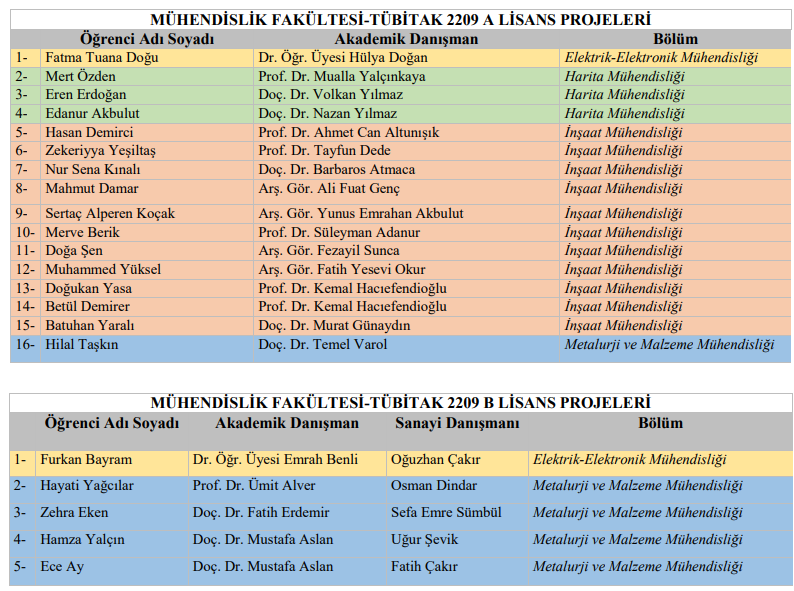 Fakültemiz öğrencileri tarafından 2022 / 1. Dönem TÜBİTAK 2209 A / B Lisans Projesi türünde başvurusu yapılan lisans projelerinden 16 tanesi TÜBİTAK 2209-A ve 5 tanesi de TÜBİTAK 2209-B kapsamında desteklenmeye hak kazanmıştır. Proje ekibinde bulunan öğrencilerimizi, akademik ve sanayi danışmanlarını tebrik eder başarılarının devamını dileriz. Detaylı bilgi için tıklayınız