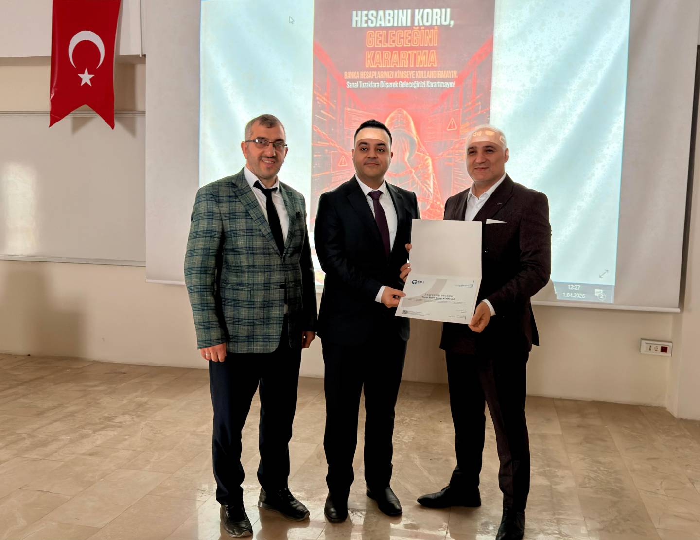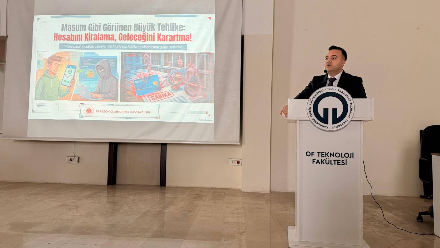 Üniversitemiz ile Trabzon Cumhuriyet Başsavcılığı tarafından organize edilen eğitim fakültemiz konferans salonunda yapıldı. Of Cumhuriyet Savcısı Yusuf Ozan Korkmaz tarafından verilen eğitimde; öğrencilerin ıban dolandırıcığı hakkında duyarlı olmaları vurgusu yapıldı. Banka hesabını temiz duygularla kullandırılarak art niyetli kişilerin suç ortağı haline gelmemeleri uyarısı yapıldı. Eğitim sonunda öğrencilerin sorularını Savcı Korkmaz cevapladı.