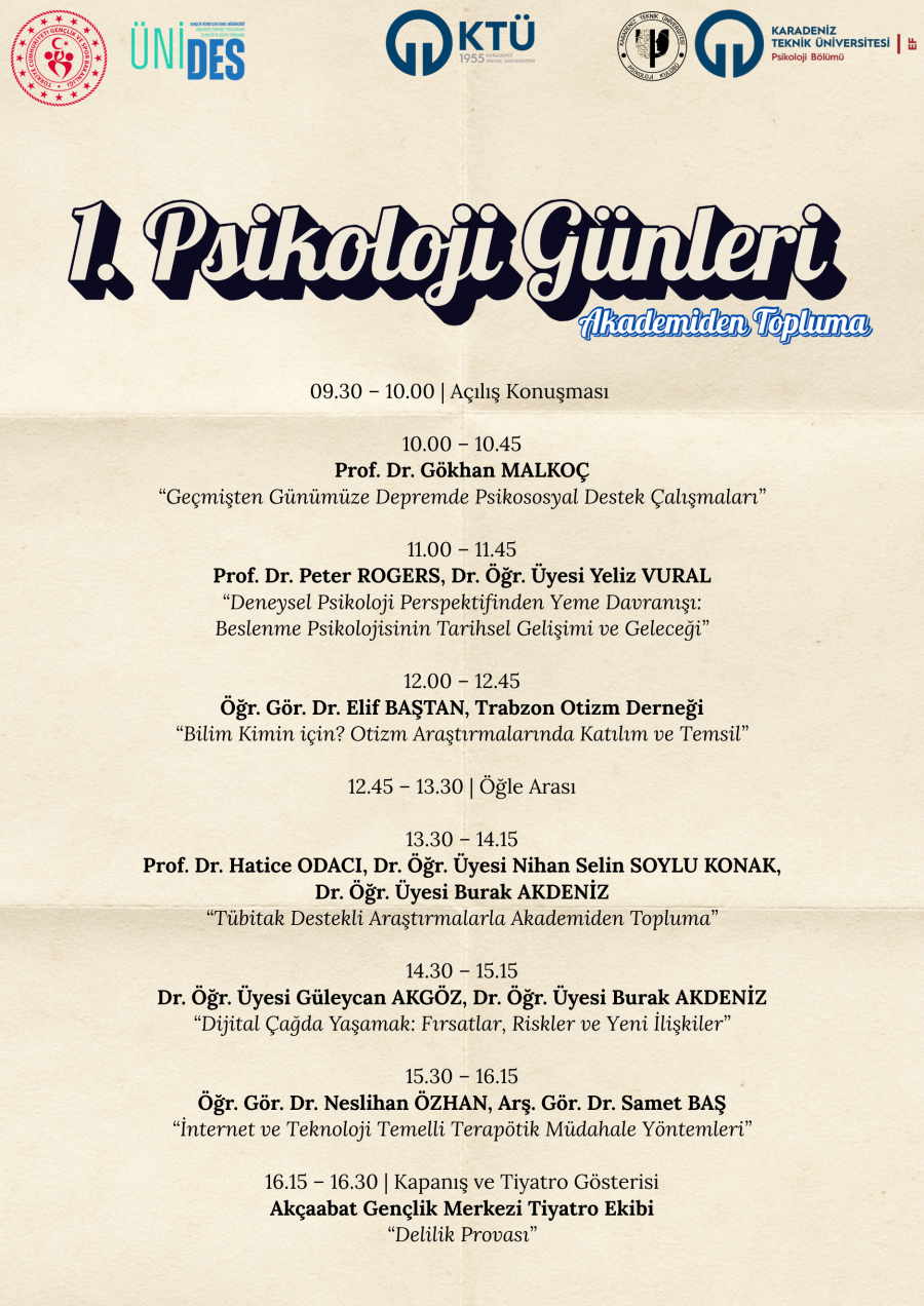 Karadeniz Teknik Üniversitesi Psikoloji Bölümü tarafından düzenlenen "1.Psikoloji Günleri: Akademiden Topluma" etkinliği 7 Mayıs 2026 tarihinde gerçekleştirilecektir.
