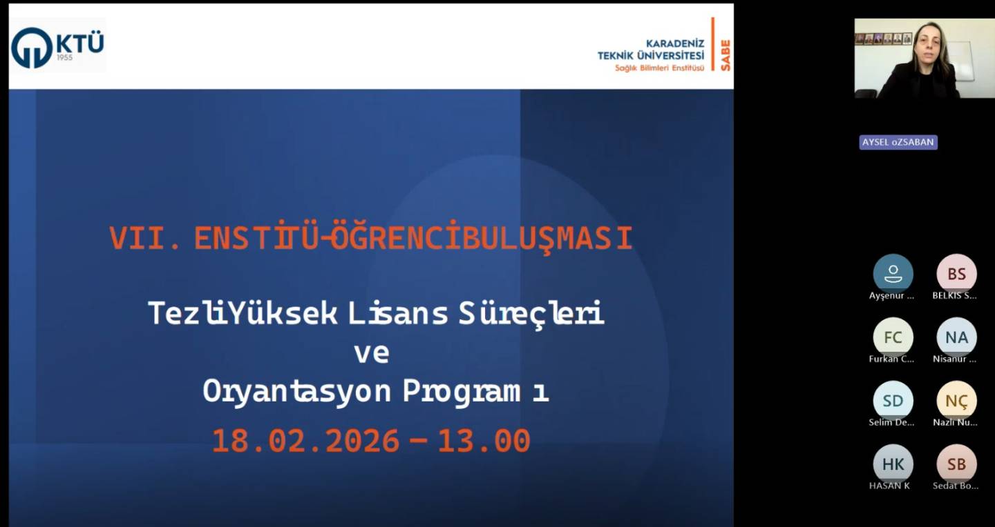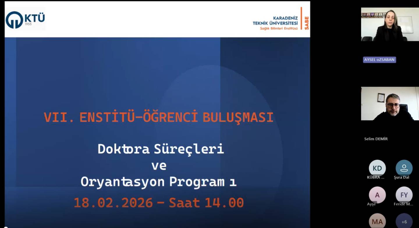 Yüksek Lisans ve Doktora öğrencilerimize yönelik “VII. Yüksek Lisans ve Doktora Öğrenci Buluşması” çevrim içi olarak 18 Şubat 2026 tarihinde Yüksek Lisans öğrencilerimiz için saat 13.00’ da Doktora öğrencilerimiz için saat 14.00' da Enstitü Müdürümüz Prof. Dr. Sedat BOSTAN' ın açılış konuşmasıyla başladı ve Enstitü Müdür Yardımcımız Doç. Dr. Aysel ÖZSABAN' ın Enstitü yönetimi, personeli, iletişim araçları, web sayfası içeriği (akademik takvimin, formlar ve dilekçeleri, iş akışları, programların zorunlu dersleri, tez hazırlama ve yazım kılavuzu, sıkça sorulan sorular, bilgi paketi, mevzuat vb.) Tezli Yüksek Lisans ve Doktora Süreçleri hakkındaki bilgi aktarımlarının ardından öğrencilerden gelen talep ve sorular cevaplandırıldı.
