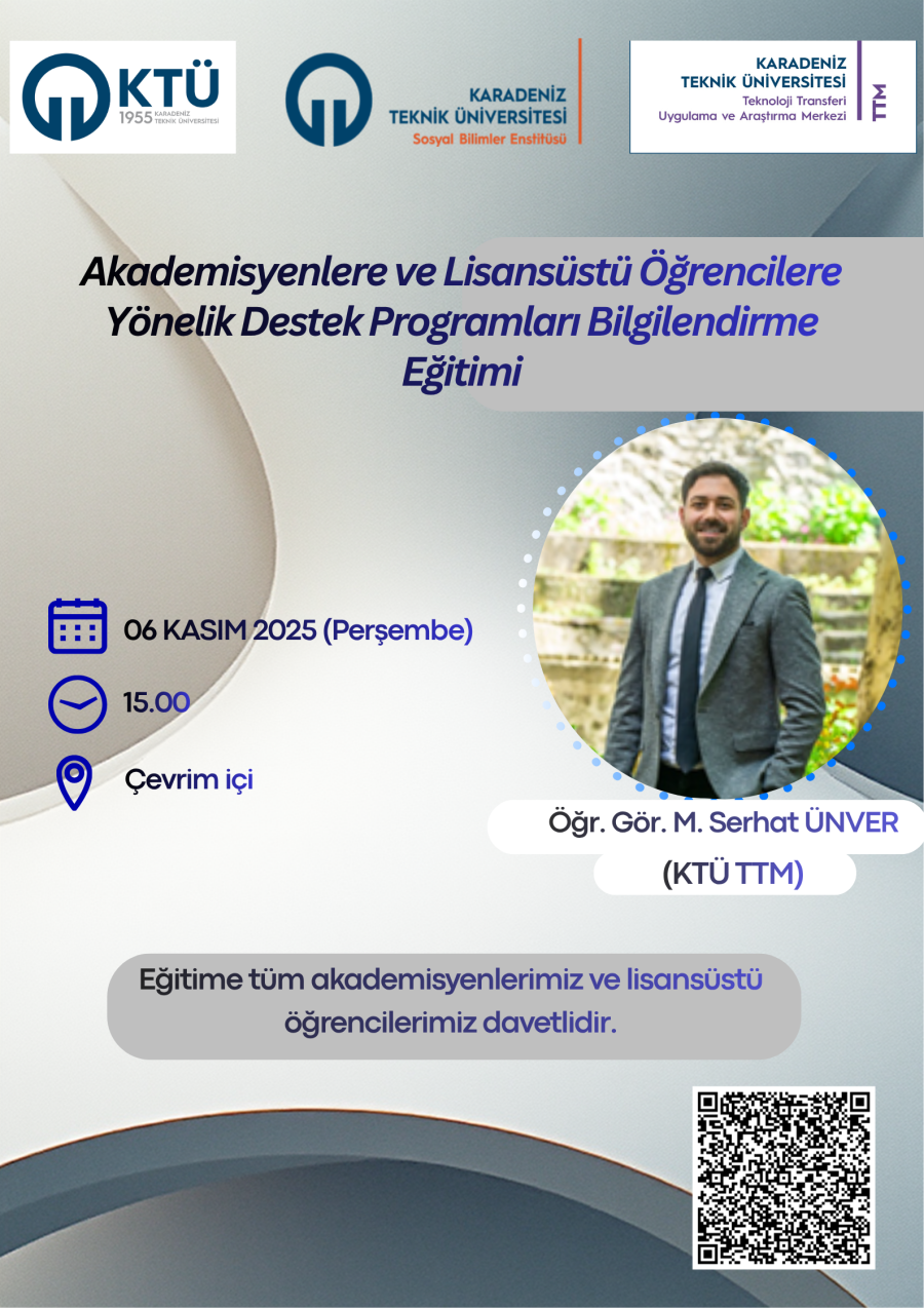 Sosyal Bilimler Enstitüsü ve KTÜ TTM İş Birliği ile 06 Kasım 2025 saat 15.00’te COST programları, TÜBİTAK ARDEB ve BİDEB programlarının anlatılacağı “Akademisyen ve Lisansüstü Öğrencilerine Yönelik Destek Programları Bilgilendirme Eğitimi” çevrim içi olarak düzenlenecektir. Eğitime tüm akademisyenlerimiz ve lisansüstü öğrencilerimiz davetlidir.