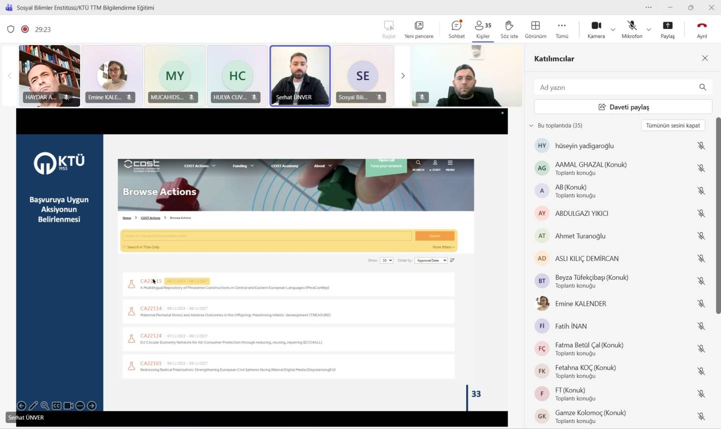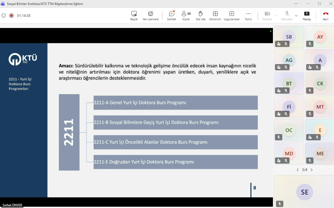 Enstitümüzce, KTÜ TTM İş Birliği ile 06 Kasım 2025 saat 15.00’te COST programları, TÜBİTAK ARDEB ve BİDEB programları hakkında çevrim içi “Akademisyen ve Lisansüstü Öğrencilerine Yönelik Destek Programları Bilgilendirme Eğitimi” düzenlenmiştir.