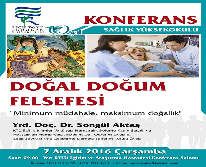 Fakültemiz Hemşirelik Bölümü; Doğum, Kadın Sağlığı ve Hastalıkları Hemşireliği AD öğretim üyesi Yard. Doç. Dr. Songül Aktaş, 7 Aralık 2016 tarihinde Rize Recep Tayyip Erdoğan Üniversitesi (RTEÜ) Sağlık Yükseokulu tarafından düzenlenen “Doğal Doğum Felsefesi” konulu konferans verdi. Aktaş konferansta; doğal doğumun (doğumun doğallığı) önemi, anne-fetus /yenidoğan-aile ve toplum sağlığı üzerine katkıları, doğumun doğallığının korunması konusunda ebe, doğum hekimi ve hemşireye düşen görevler, doğumda bire bir ebe desteğinin önemi, Sağlık bakanlığının anne-dostu hastane uygulamaları, yurt dışındaki doğum merkezleri konusuna geniş yer verdi. Doğumu kolaylaştırıcı yöntemler (masaj, pozisyonlar vb.) konusunda kanıta dayalı bilgileri; hem teorik düzeyde hem de uygulamalı olarak drama teknikleriyle (güven oyunu, rol oynama, donuk imge tekniği gibi) ve video gösterimi ile katılımcılara sundu. Konferansa dinleyici olarak ; Rize Sağlık Yüksekokulu öğrencileri ve öğretim elemanları, RTEÜ SHMYO öğretim elemanları, RTEÜ Eğitim ve Araştırma Hastanesi ve Rize Devlet Hastanesi’nde görev yapan ebe ve hemşireler katıldı. Soru cevap bölümü ile sona eren konferansta, konuşmacı Aktaş’a RTEÜ yönetimi tarafından şilt takdim edildi. Aktaş’ın konuşmacı olarak katıldığı konferansa, RTE Üniversitesi’nin web sayfasında ve Rize’nin yerel gazetesi Olay53’te geniş yer verildi. RTE Üniversitesi Sağlık Yüksekokulu Düzenleme Kurulu ve Yard. Doç. Dr. Songül Aktaş’a emeklerinden dolayı teşekkür ederiz.