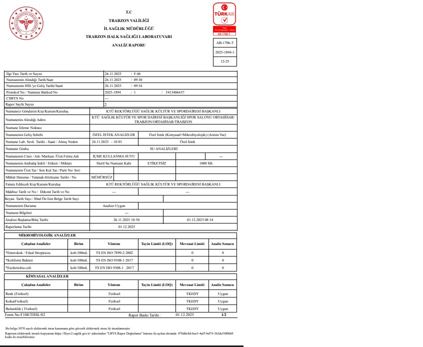 Üniversitemiz Hasan Polat Beden Eğitimi ve Spor Merkezinde sağlıklı(ücretsiz) içme suyu istasyonu bulunmakta ve düzenli olarak denetimleri yapılmaktadır.