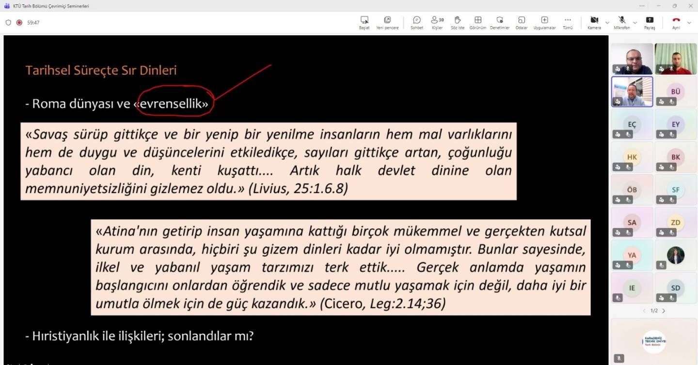22.10.2025 tarihinde saat 20:00'da Anadolu Üniversitesi hocalarından Prof. Dr. Erkan İznik'in sunumu ile İlkçağın Sır Kültleri adlı çevrimiçi seminer KTÜ tarih bölümü hocaları ve öğrencilerinin de katılımı ile gerçekleştirilmiştir.