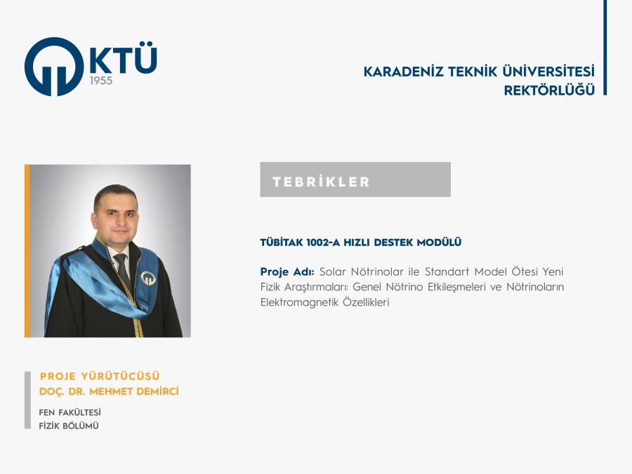 Etkileşmeleri ve Nötrinoların Elektromagnetik Özellikleri" başlıklı projesi, “TÜBİTAK 1002-A Hızlı Destek Modülü” kapsamında desteklenmiştir.