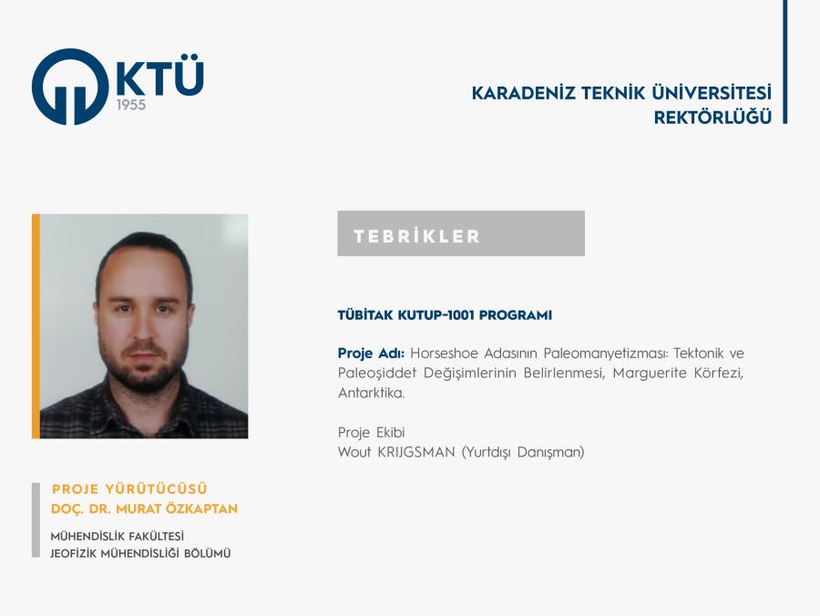 Üniversitemiz Mühendislik Fakültesi Jeofizik Mühendisliği Bölümü öğretim üyesi Doç. Dr. Murat ÖZKAPTAN’ın "Horseshoe Adasının Paleomanyetizması: Tektonik ve Paleoşiddet Değişimlerinin Belirlenmesi, Marguerite Körfezi, Antarktika." başlıklı projesi, “TÜBİTAK KUTUP-1001 Programı” kapsamında desteklenmiştir.