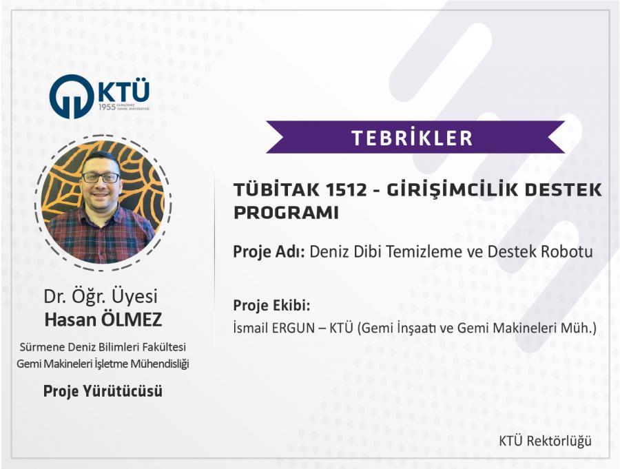 Üniversitemiz Sürmene Deniz Bilimleri Fakültesi Gemi Makineleri İşletme Mühendisliği Bölümü Öğretim Üyesi Dr. Öğr. Üyesi Hasan ÖLMEZ’in, “Deniz Dibi Temizleme ve Destek Robotu” başlıklı projesi, TÜBİTAK 1512 Girişimcilik Destek Programı (BİGG) kapsamında desteklendi.