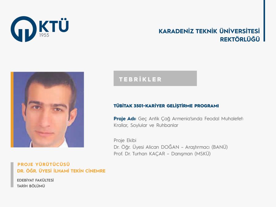 Üniversitemiz Edebiyat Fakültesi Tarih Bölümü öğretim üyesi Dr. Öğr. Üyesi İlhami Tekin CİNEMRE’nin " Geç Antik Çağ Armenia’sında Feodal Muhalefet: Krallar, Soylular ve Ruhbanlar" başlıklı projesi “TÜBİTAK 3501-Kariyer Geliştirme Programı” kapsamında desteklenmiştir.