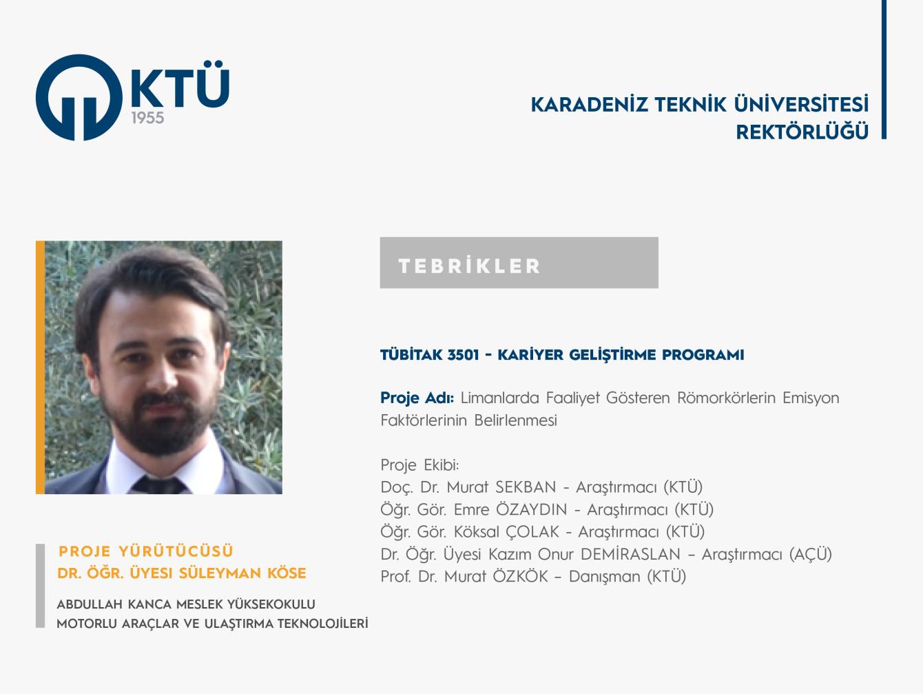 Dr. Öğr. Üyesi Süleyman KÖSE'ye TÜBİTAK 3501 Proje Desteği