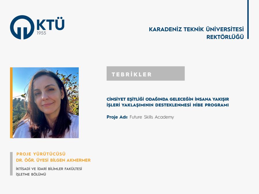 Karadeniz Teknik Üniversitesi ortaklığında ve Trabzon Ticaret ve Sanayi Odası yürütücülüğünde; Aile, Çalışma ve Sosyal Hizmetler Bakanlığı Avrupa Birliği ve Mali Yardımlar Daire Başkanlığı tarafından fonlanan “Cinsiyet Eşitliği Odağında Geleceğin İnsana Yakışır İşleri Yaklaşımının Desteklenmesi Hibe Programı”na sunulan "Future Skills Academy” isimli proje desteklenmeye hak kazanmıştır.