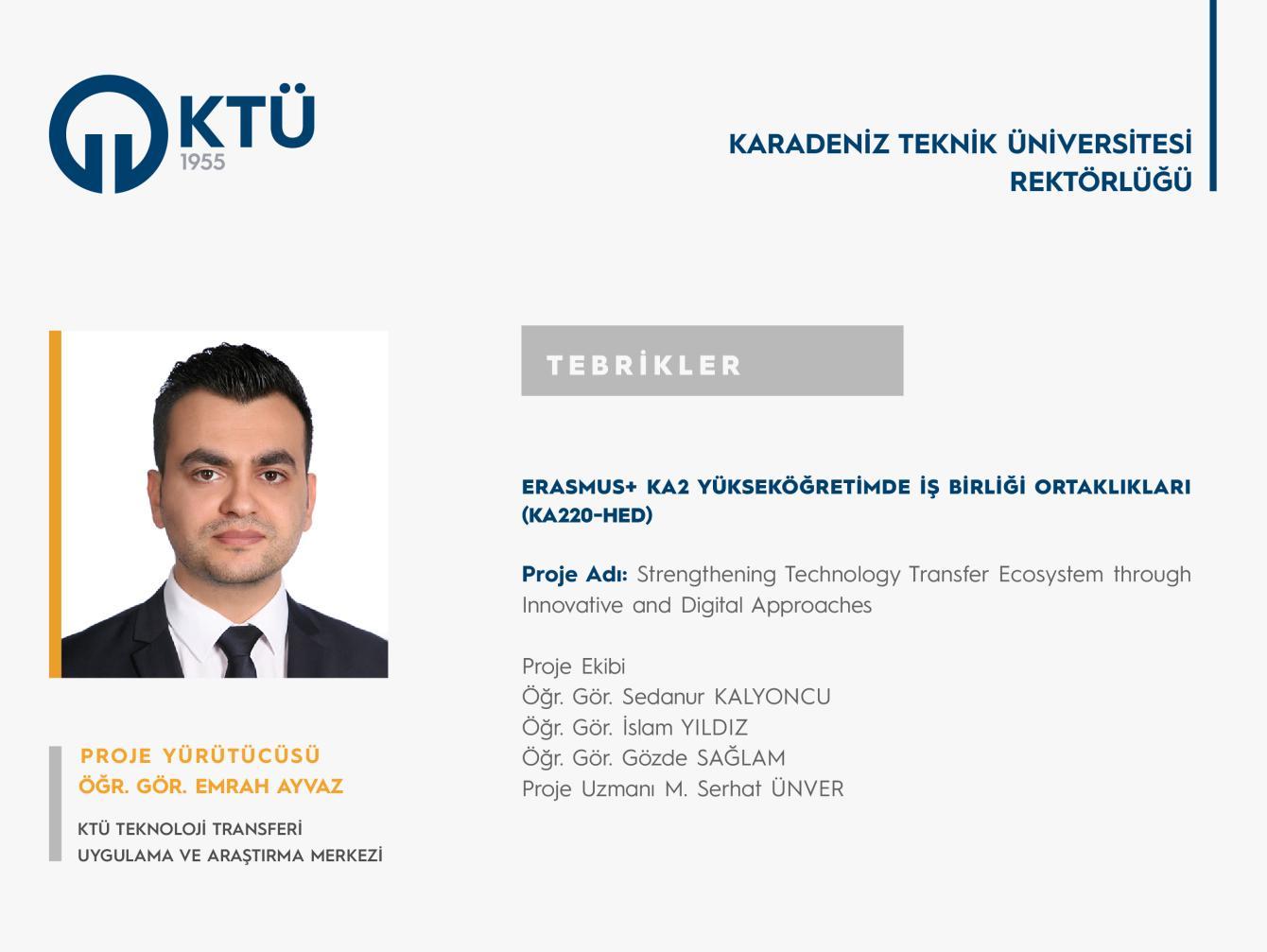 Üniversitemizin yürütücü olarak yer aldığı ve 2023 yılında Erasmus+ Programı KA2 Yükseköğretimde İş Birliği Ortaklıkları (KA220-HED) kapsamında açılan teklif çağrısına “Strengthening Technology Transfer Ecosystem through Innovative and Digital Approaches” ismiyle sunulan proje başvurusu desteklenmeye hak kazanmıştır.