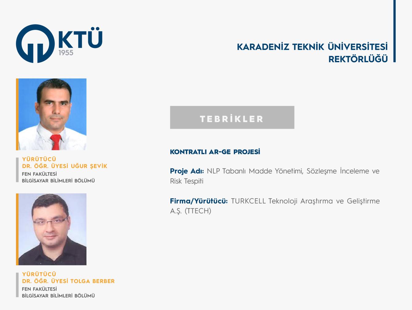 Fen Fakültesi, Bilgisayar Bilimleri Bölümü Öğretim Üyeleri Dr. Öğr. Üyesi Tolga BERBER ve Dr. Öğr. Üyesi Uğur ŞEVİK’in 2021 yılında TURKCELL Teknoloji Araştırma ve Geliştirme A.Ş. (TTECH) ile başlatmış olduğu “NLP Tabanlı Madde Yönetimi, Sözleşme İnceleme ve Risk Tespiti” isimli Kontratlı Ar-Ge Projesi başarılı bir şekilde sonuçlanarak bu yılki 2. ödülünü almaya hak kazandı.
