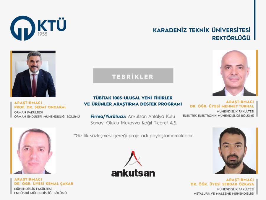 Üniversitemiz iş birliği ile hazırlanan ve Ankutsan Antalya Kutu Sanayi Oluklu Mukavva Kağıt Ticaret A.Ş.'nin yürütücü olarak yer aldığı proje, TÜBİTAK 1005-Ulusal Yeni Fikirler ve Ürünler Araştırma Destek Programı kapsamında desteklenmeye hak kazanmıştır.