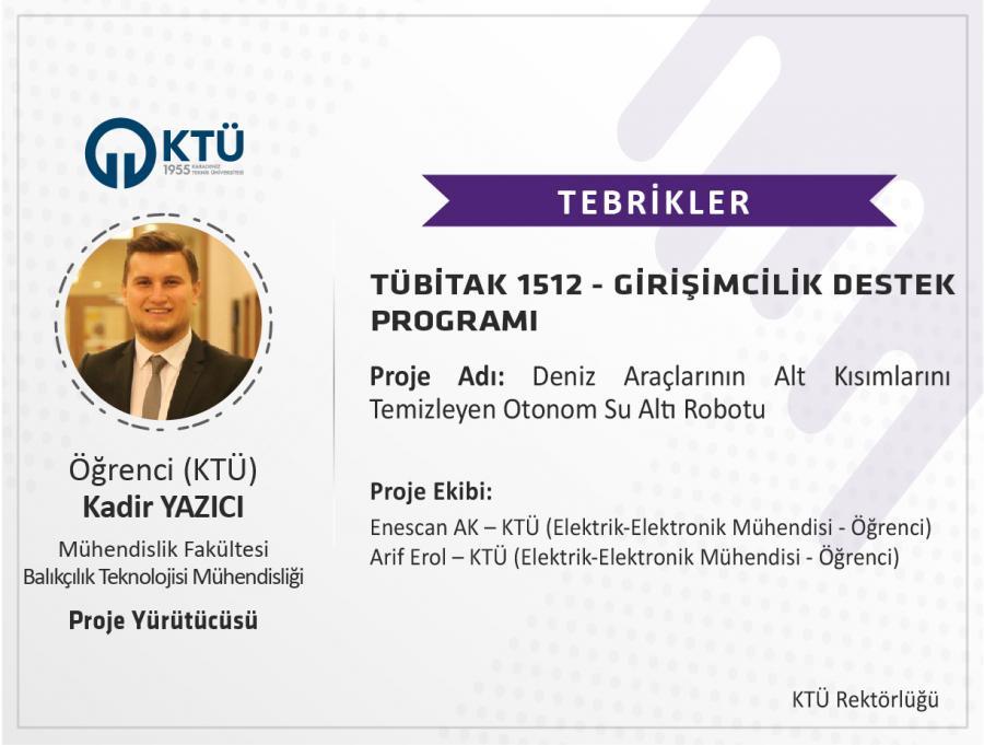 Üniversitemiz Fen Bilimleri Enstitüsü Balıkçılık Teknolojisi Mühendisliği Bölümü yüksek lisans öğrencilerinden Kadir YAZICI’nın, “Deniz Araçlarının Alt Kısımlarını Temizleyen Otonom Su Altı Robotu” başlıklı projesi, TÜBİTAK 1512 Girişimcilik Destek Programı (BİGG) kapsamında desteklendi.