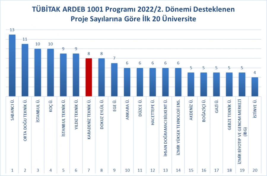 Üniversitemizden 32 proje başvurusunda bulunulmuş ve desteklenmeye hak kazanan 8 projeyle KTÜ; projeleri desteklenen 89 üniversite arasında 7. sırada yer almış ve %25 desteklenme oranı ile ortalamanın üzerinde yer almıştır. Üniversitemizden yapılan 3 proje önerisinin ise bir sonraki dönemi beklemeden başvuru yapılabilmesine karar verilmiştir.