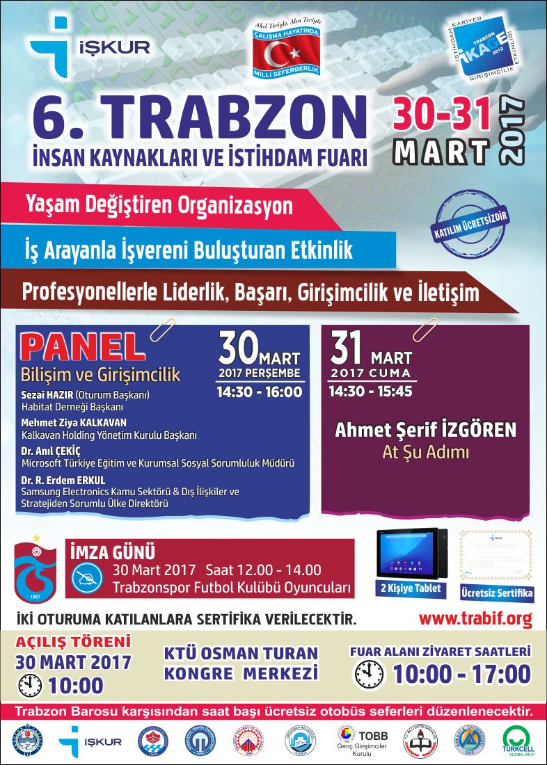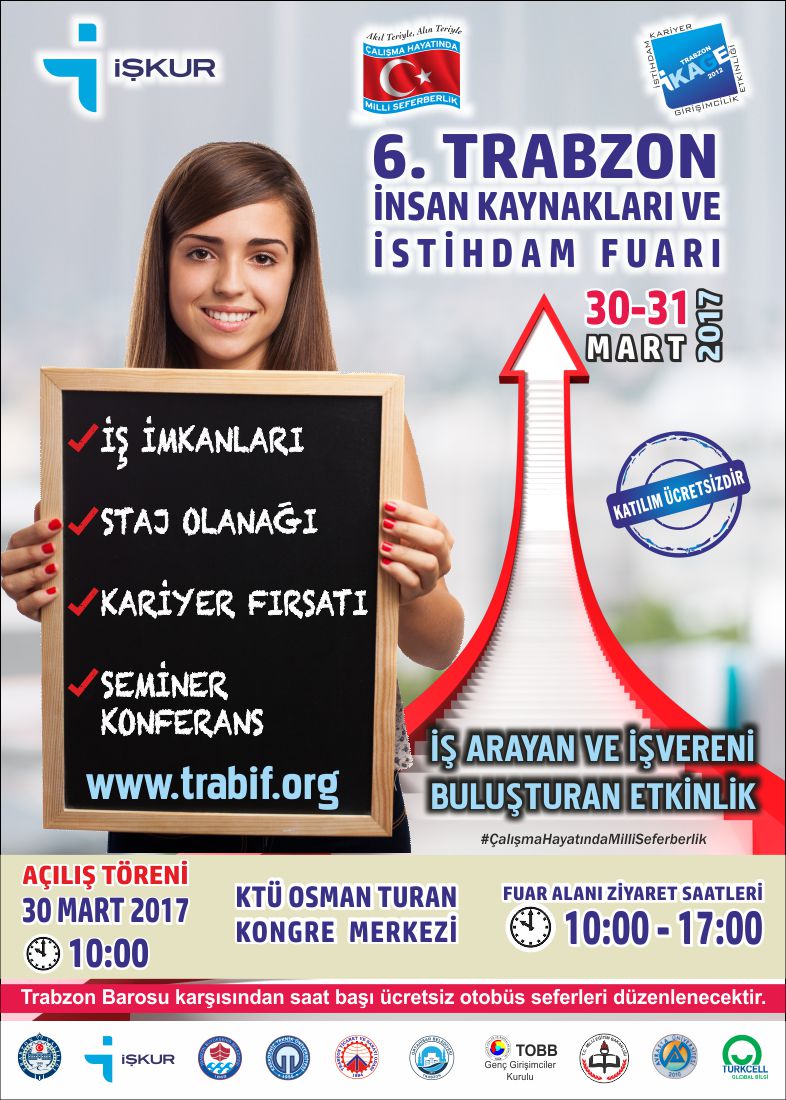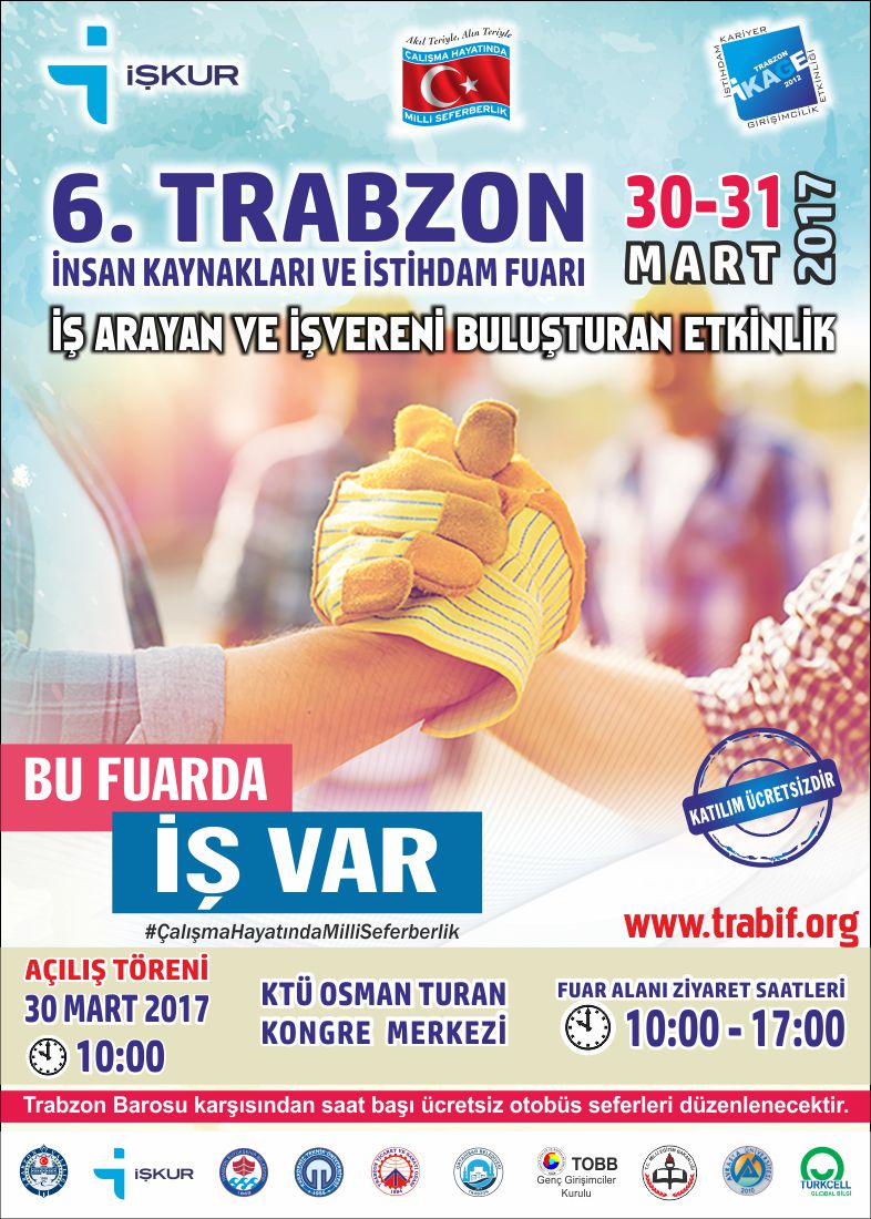 30-31 Mart 2017 tarihlerinde Karadeniz Teknik Üniversitesi Osman Turan Kongre Merkezi’nde Trabzon Çalışma ve İş Kurumu İl Müdürlüğü organizatörlüğünde üniversiteler ve diğer kurum ve kuruluşların ortak/destekçi olduğu “6.Trabzon İnsan Kaynakları Ve İstihdam Fuarı” düzenlenecektir.
