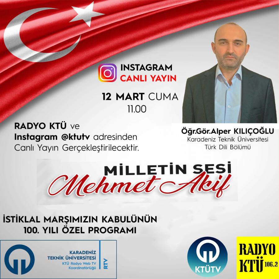 "İstiklal ve istikbal mücadelemizin en çetin geçtiği dönemlerde yüreği vatan-millet sevgisiyle ve bağımsızlık aşkıyla yanan Mehmet Akif Ersoy'un kaleme aldığı İstiklal Marşı aziz milletimizin hislerine tercüman olmuştur. Özel programı Radyo KTÜ'den ve KTÜ TV Instagram hesabından izleyebilirsiniz."