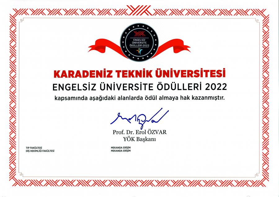 Yükseköğretim Kurulu (YÖK) tarafından üniversitelerde engelsiz bir ekosistemin oluşturulmasını teşvik etmek amacıyla gerçekleştirilen 2022 Yılı Engelsiz Üniversiteler Ödülleri açıklandı. KTÜ Tıp Fakültesi ve Diş Hekimliği Fakültesi, engelliler için tüm mekânlarının erişilebilir olduğunu Turuncu Bayrak Ödülü'nü kazanarak tescilledi.