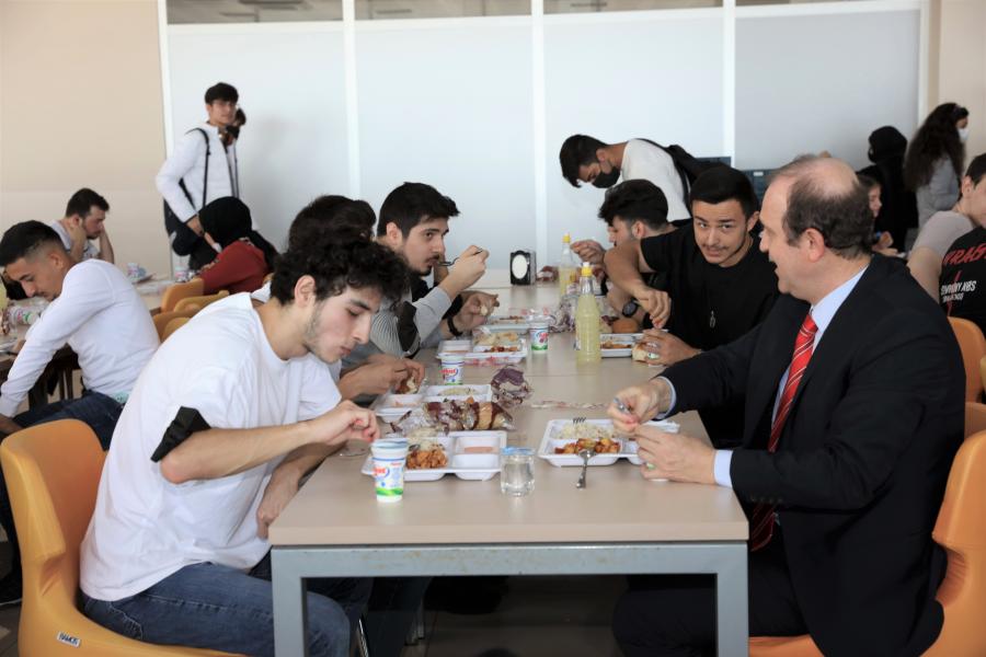 2021-2022 Akademik Yılı ile birlikte yüz yüze eğitimin başlamasının ardından okullarına kavuşan öğrencilerimiz ile sohbet ederek öğle yemeği yedi. Öğrencilerimizin talep ve önerilerini dinledikten sonra incelemelerde bulunan ve başta beslenme, barınma, ulaşım olmak üzere onların tüm sosyal olanaklarının, en yüksek standartlarda sunulması adına çok çaba sarf edildiğini vurgulayan Rektörümüz, yüksek kaliteli yemek hizmetlerinden öğrencilerimizin cüzi bir miktar ödeme yaparak faydalandığını ve bir öğünde öğrencilerimize 4,00 TL karşılığında verilen ve ihale yöntemi ile alınan dört çeşit öğle yemeğinin maliyetinin, 2021 yılı sonuna kadar 19,32 TL olup bu ücretin 15,32 TL’sinin Üniversitemiz tarafından karşılandığını, 4,00 TL’sinin ise öğrencilerimiz tarafından ödendiğini dile getirdi.
