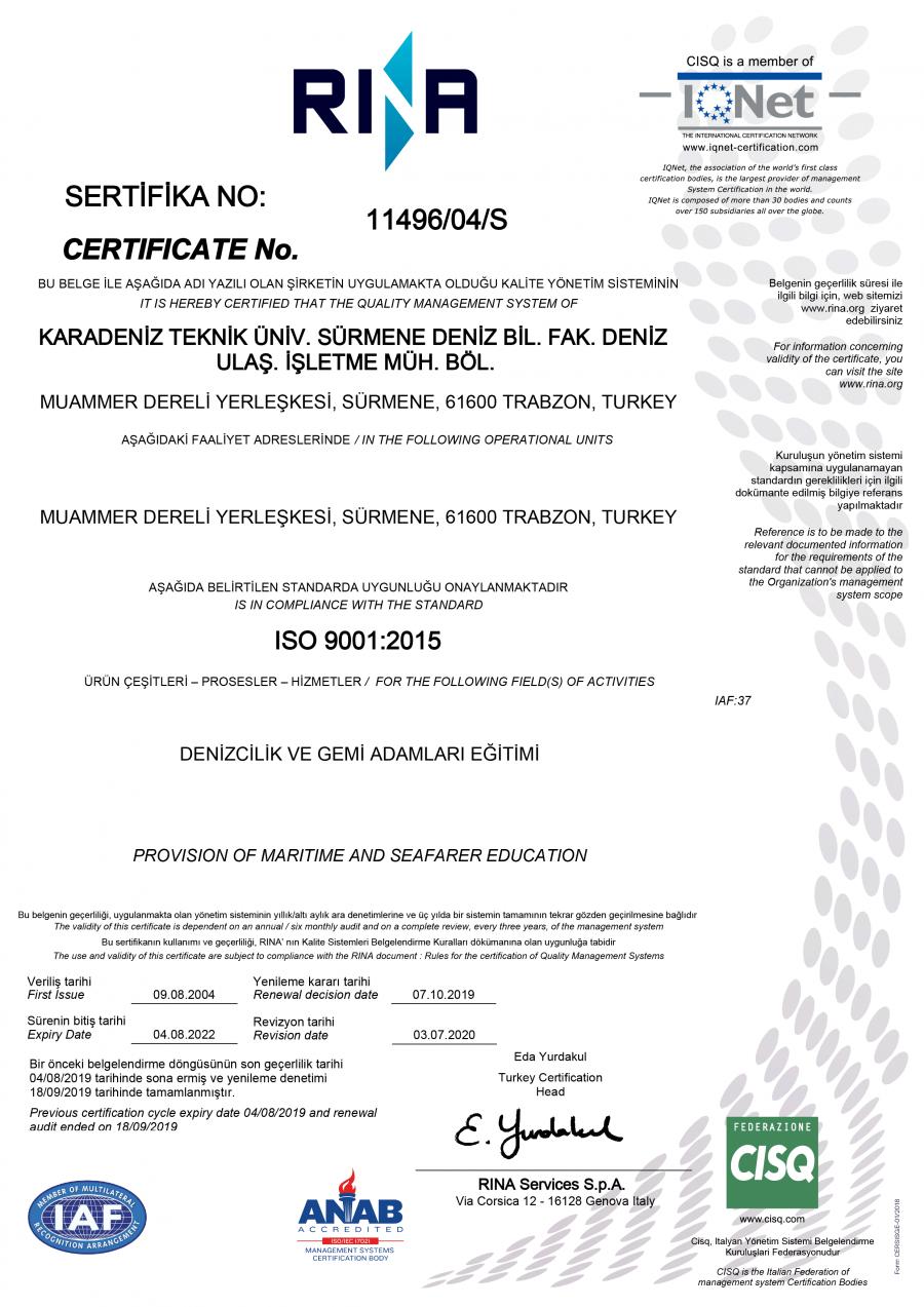 Üniversitemiz, Sürmene Deniz Bilimleri Fakültesi Deniz Ulaştırma İşletme Mühendisliği Bölümünün "Denizcilik ve Gemiadamları Eğitimi" alanında uygulamakta olduğu Kalite Yönetim Sistemi, 15.09.2021 tarihinde, uluslararası akreditasyon kuruluşu RINA tarafından yapılan ISO 9001:2015 denetimini başarıyla tamamlamıştır.