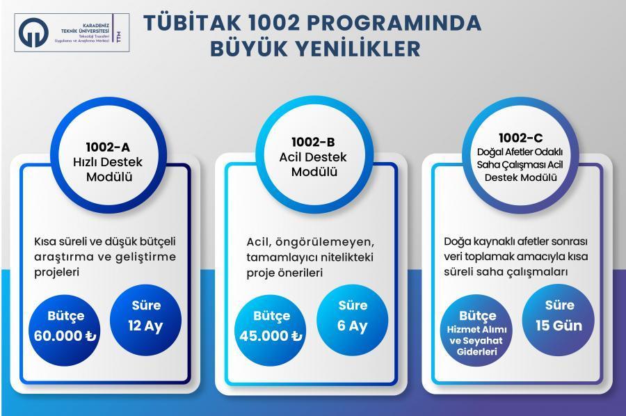 TÜBİTAK ARDEB 1002 Hızlı Destek Programı’na 16.06.2022 tarihi itibariyle birçok yenilik getirilmiştir. Programa getirilen yeniliklerle birlikte başvurular 3 farklı modül altında gerçekleştirilebilecektir. Ayrıca her modülün bütçesi, süresi, değerlendirme kriterleri ve başvuru formlarında da değişiklikler yapılmıştır.