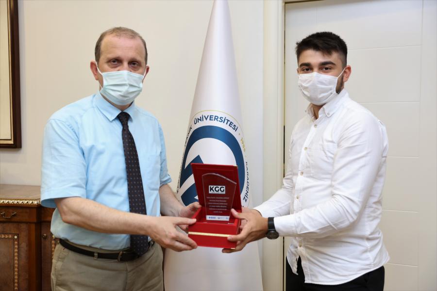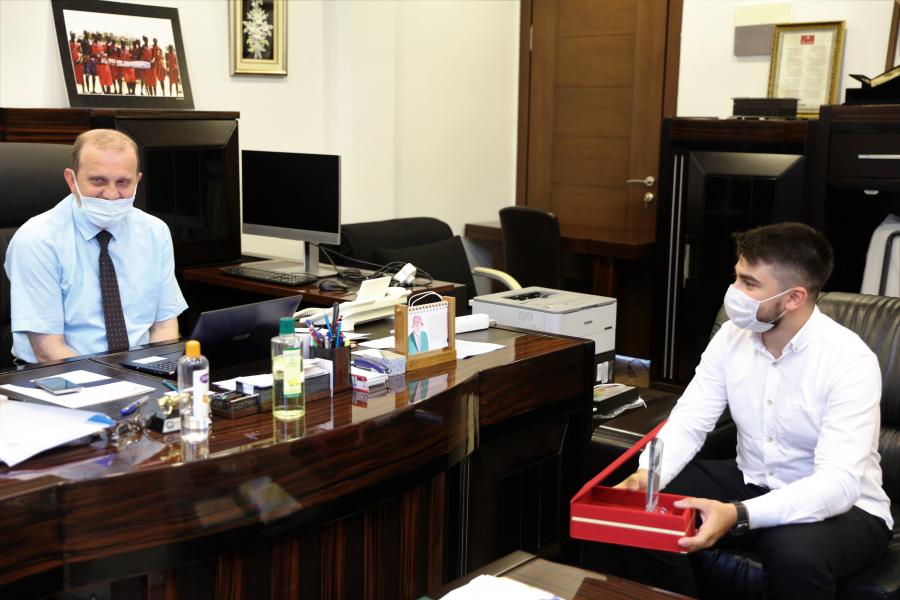 Üniversitemiz Elektrik-Elektronik Kulübü Yönetim Kurulu Üyesi ve Kariyer Gelişim Günleri Koordinatörü Ömer Faruk MALKOÇ, kulüp öğrencilerinin düzenlemiş olduğu, 11. Kariyer Gelişim Günleri etkinliğine katılarak açılış konuşmasını gerçekleştiren Rektörümüz Prof. Dr. Hamdullah ÇUVALCI’yı makamında ziyaret ederek kendisine teşekkür plaketi takdim etti.