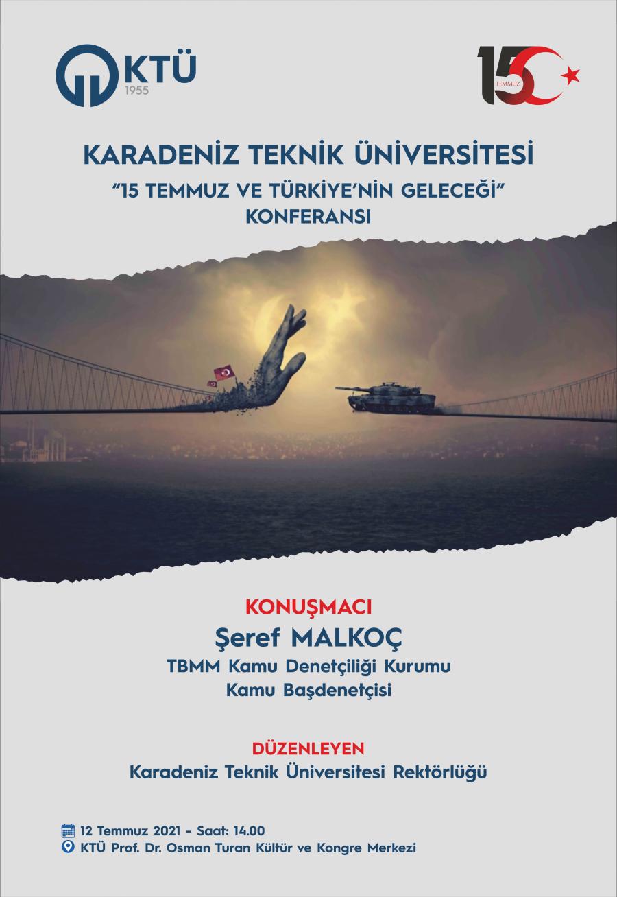 Üniversitemizin ev sahipliğini üstlendiği “15 Temmuz ve Türkiye’nin Geleceği” Konferansı, TBMM Kamu Denetçiliği Kurumu Kamu Başdenetçisi Şeref MALKOÇ’un konuşmacı olarak teşrifleriyle 12 Temmuz 2021 Pazartesi günü, saat 14.00’te Karadeniz Teknik Üniversitesi Prof. Dr. Osman TURAN Kongre Merkezi’nde gerçekleştirilecektir.
