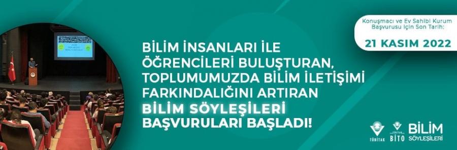 Bilim ve Toplum Başkanlığı tarafından bilim insanlarını öğrencilerle buluşturarak toplumumuzda bilim farkındalığını ve okuryazarlığını geliştirmek, bilim dünyası ile toplumumuzun bilim iletişimini arttırmak amaçlarıyla 6 Şubat - 2 Haziran 2023 tarihleri arasında düzenlenecek Bilim Söyleşileri için son başvuru tarihi 21 Kasım 2022 olarak belirlenmiştir.