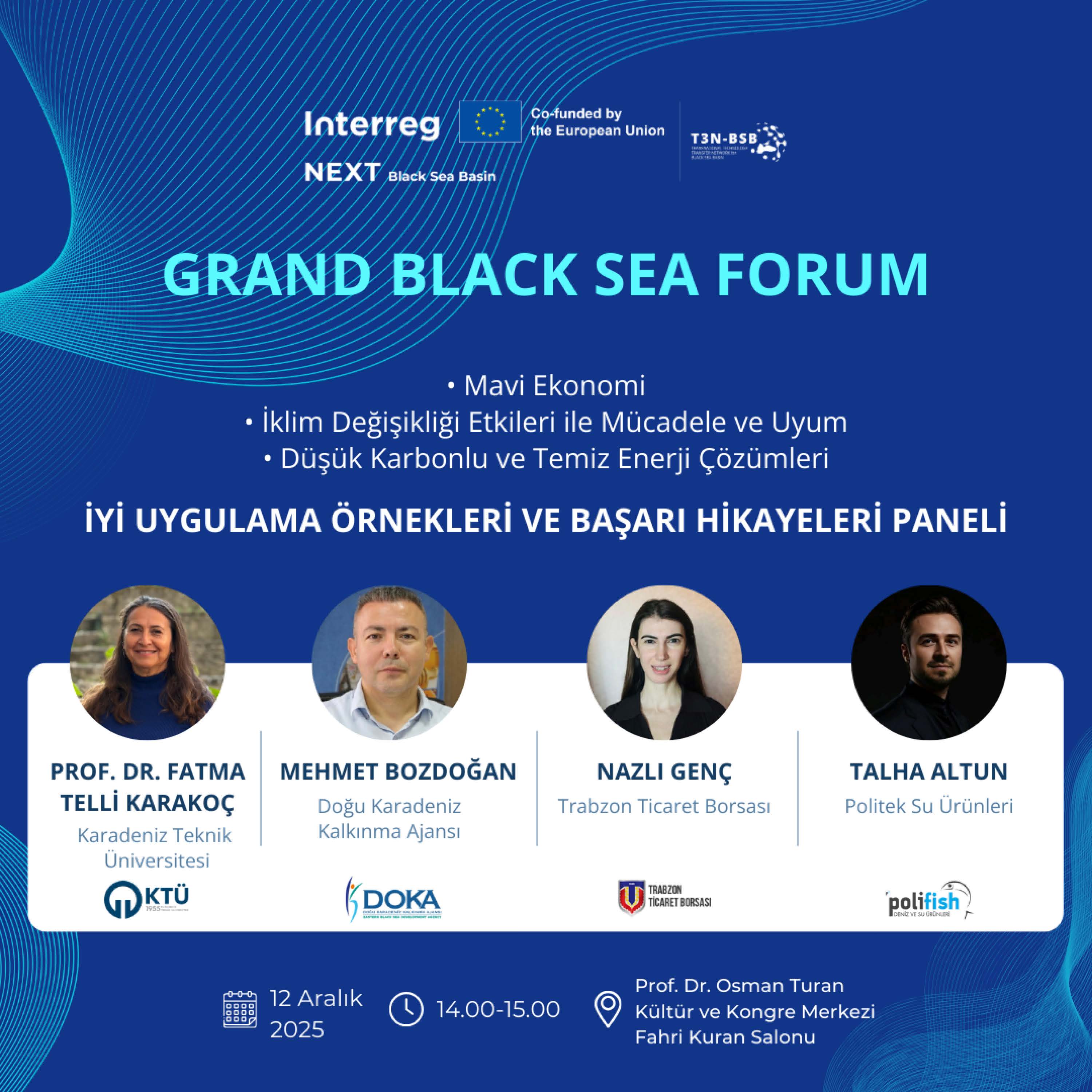 Mavi Ekonomi, iklim değişikliğiyle mücadele ve uyum, düşük karbonlu temiz enerji çözümleri üzerine İyi Uygulama Örnekleri ve Başarı Hikâyeleri Paneli: Karadeniz Teknik Üniversitesi, Doğu Karadeniz Kalkınma Ajansı, Trabzon Ticaret Borsası ve Politek Su Ürünleri temsilcileri ilgili alanda kurumsal deneyimlerini katılımcılarla paylaşacaklardır.