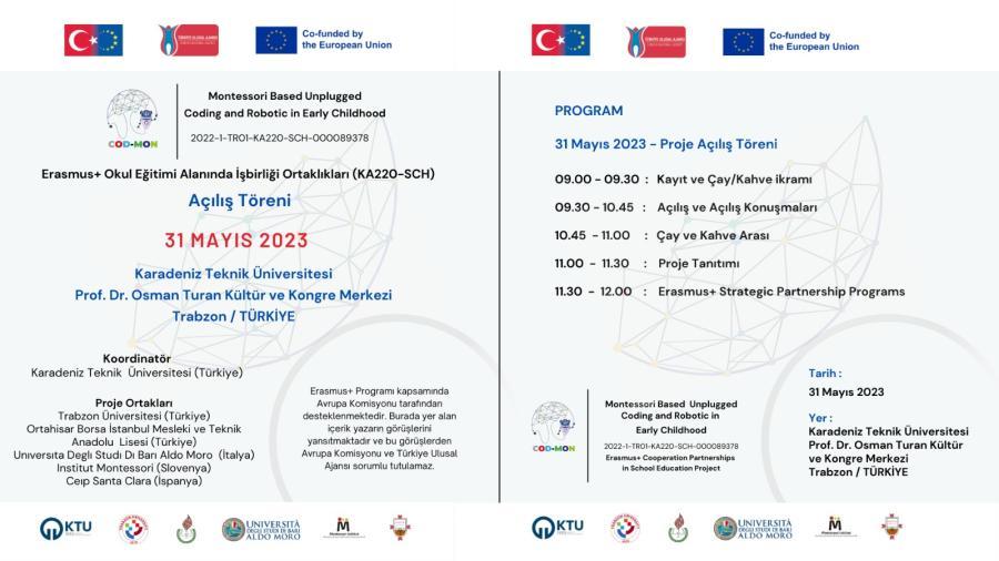 Karadeniz Teknik Üniversitesi koordinatörlüğünde Erasmus+ Okul Eğitiminde İş Birliği Ortaklıkları (KA220-SCH) kapsamında desteklenen “Montessori Based Unplugged Coding and Robotic in Early Childhood” adlı projenin 31 Mayıs Çarşamba günü saat 09:15 de Prof. Dr. Osman Turan Kültür ve Kongre Merkezi’nde “Açılış Töreni” etkinliği gerçekleştirilecektir.