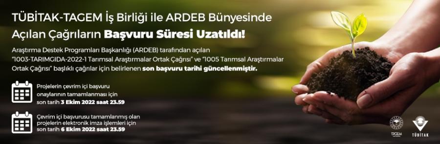 TÜBİTAK ile Tarımsal Araştırmalar Politikalar Genel Müdürlüğü (TAGEM) arasında yapılan işbirliği protokolü kapsamında Araştırma Destek Programları Başkanlığı (ARDEB) tarafından açılan “1003-TARIMGIDA-2022-1 Tarımsal Araştırmalar Ortak Çağrısı” ve “1005 Tarımsal Araştırmalar Ortak Çağrısı” başlıklı çağrılar için belirlenen son başvuru tarihi güncellenmiştir.
