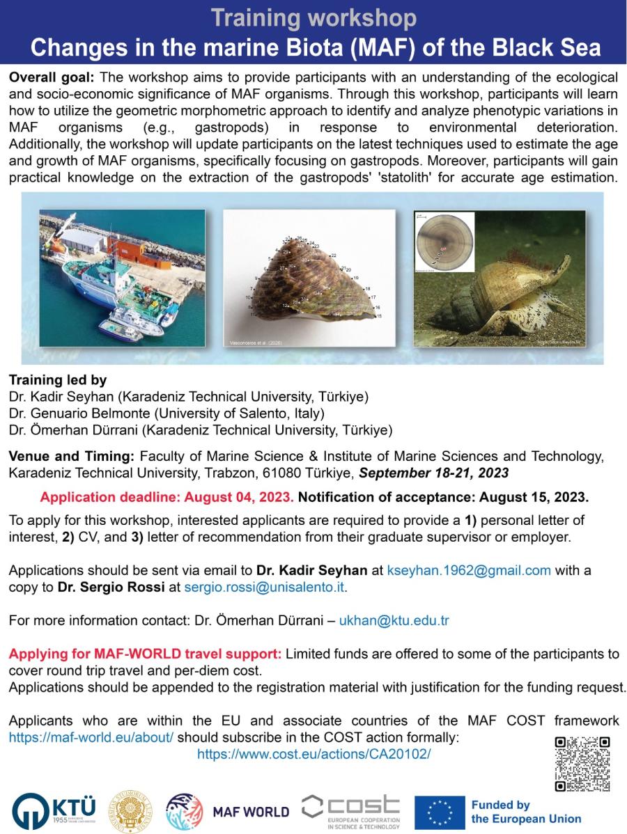 COST CA20102 “Marine Animal Forest of the world” aksiyonu çerçevesinde 18-21 Eylül 2023 tarihleri arasında KTÜ Deniz Bilimleri ve Teknolojisi Enstitüsü ve Sürmene Deniz Bilimleri Fakültesi’nde “Changes in the marine Biota (MAF) of the Black Sea” eğitim çalıştayı düzenlenecektir. Çalıştay hakkında detaylı bilgi için tıklayınız.