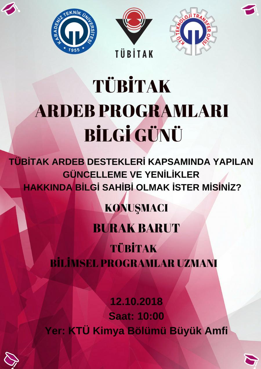 KTÜ Teknoloji Transfer Ofisi ve TÜBİTAK Araştırma Destek Programları Başkanlığı (ARDEB) işbirliğiyle; üniversitemizde özellikle TÜBİTAK 1001, 1002, 1005 ve 3501 programları başta olmak üzere tüm ARDEB programlarında yapılan güncellemeler ile ilgili 12 Ekim 2018 Cuma günü bir bilgilendirme etkinliği düzenlenecektir.