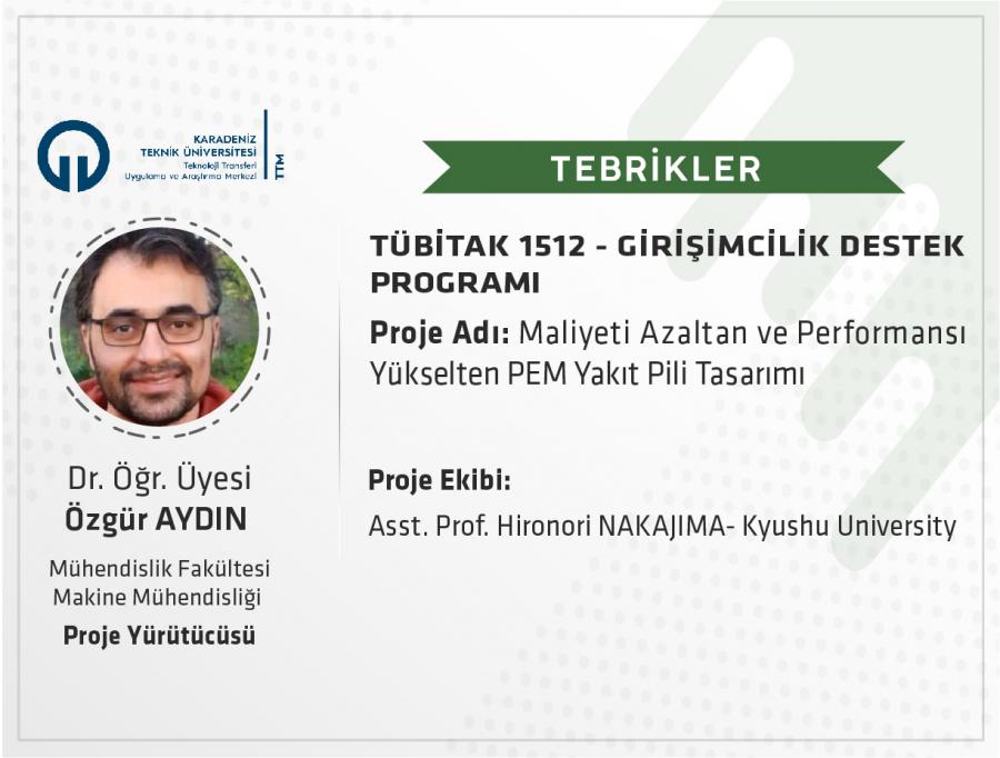 Üniversitemiz Mühendislik Fakültesi Makine Mühendisliği Bölümü öğretim üyelerinden Dr. Öğr. Üyesi Özgür AYDIN'ın, “Maliyeti Azaltan ve Performansı Yükselten PEM Yakıt Pili Tasarımı” başlıklı projesi, TÜBİTAK 1512 Programı kapsamında desteklendi.