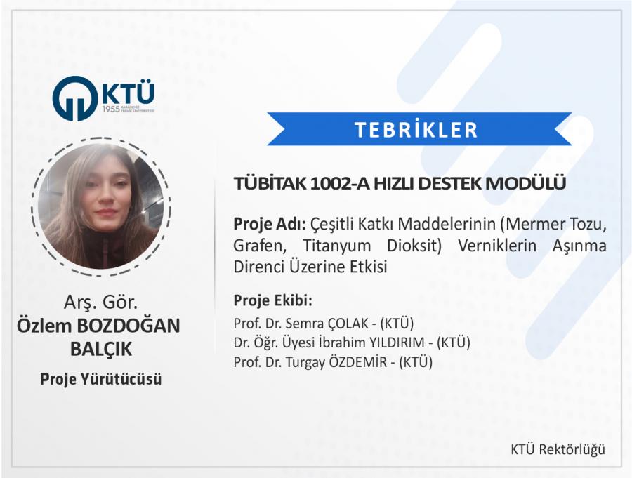 Üniversitemiz Orman Fakültesi Orman Endüstri Mühendisliği Bölümü Öğretim Üyesi Arş. Gör. Özlem BOZDOĞAN BALÇIK’ın "Çeşitli Katkı Maddelerinin (Mermer Tozu, Grafen, Titanyum Dioksit) Verniklerin Aşınma Direnci Üzerine Etkisi" başlıklı projesi “TÜBİTAK 1002-A Hızlı Destek Modülü” kapsamında desteklenmiştir.
