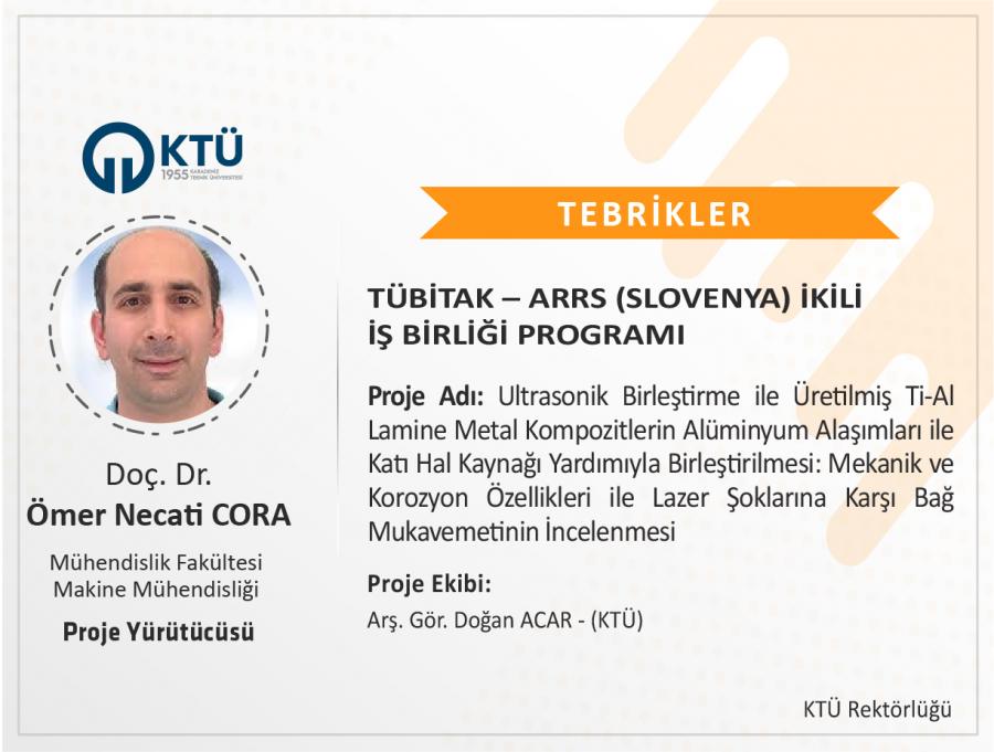 Üniversitemiz Mühendislik Fakültesi Makine Mühendisliği Bölümü Öğretim Üyesi Doç. Dr. Ömer Necati CORA’nın "Ultrasonik Birleştirme ile Üretilmiş Ti-Al Lamine Metal Kompozitlerin Alüminyum Alaşımları ile Katı Hal Kaynağı Yardımıyla Birleştirilmesi: Mekanik ve Korozyon Özellikleri ile Lazer Şoklarına Karşı Bağ Mukavemetinin İncelenmesi" başlıklı projesi “TÜBİTAK – ARRS (Slovenya) İkili İş Birliği Programı” kapsamında desteklenmiştir.