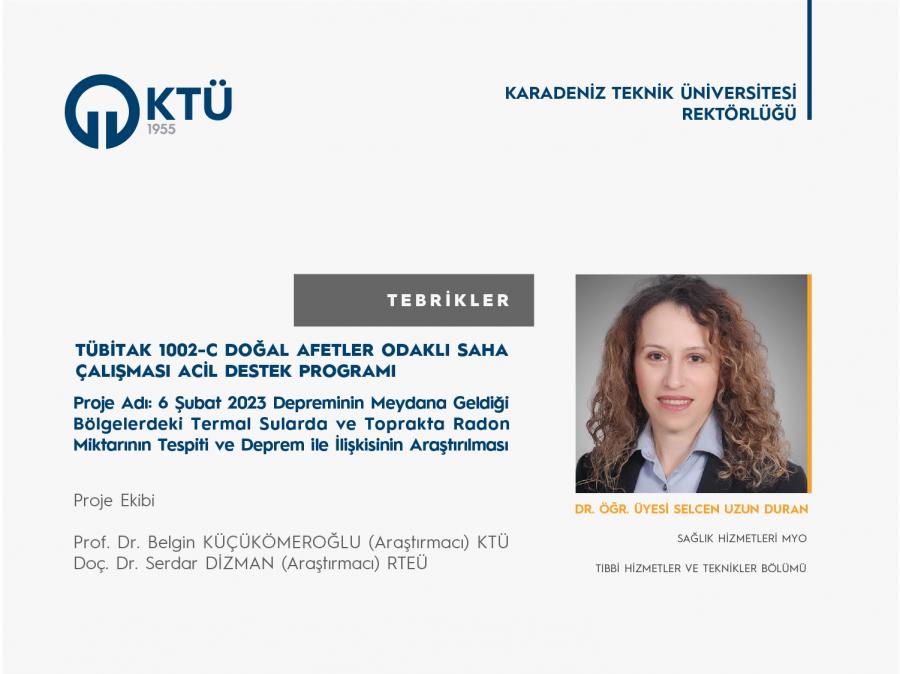 Üniversitemiz Sağlık Hizmetleri Meslek Yüksekokulu Tıbbi Hizmetler ve Teknikler Bölümü öğretim üyesi Dr. Öğr. Üyesi Selcen UZUN DURAN’ın "6 Şubat 2023 Depreminin Meydana Geldiği Bölgelerdeki Termal Sularda ve Toprakta Radon Miktarının Tespiti ve Deprem ile İlişkisinin Araştırılması" başlıklı projesi “TÜBİTAK 1002-C Doğal Afetler Odaklı Saha Çalışması Acil Destek Programı” kapsamında desteklenmiştir.