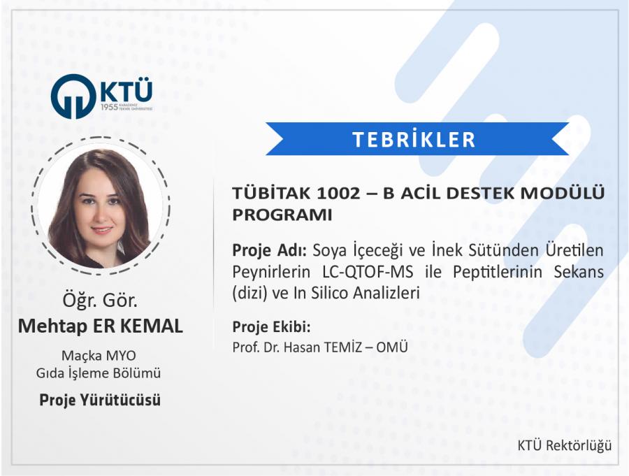 Üniversitemiz Maçka Meslek Yüksekokulu Gıda İşleme Bölümü öğretim üyesi Öğr. Gör. Mehtap ER KEMAL'in "Soya içeceği ve inek sütünden üretilen peynirlerin LC-QTOF-MS ile peptitlerinin sekans (dizi) ve in silico analizleri" başlıklı projesi TÜBİTAK 1002 – B “Acil Destek Modülü Programı” kapsamında desteklenmiştir.