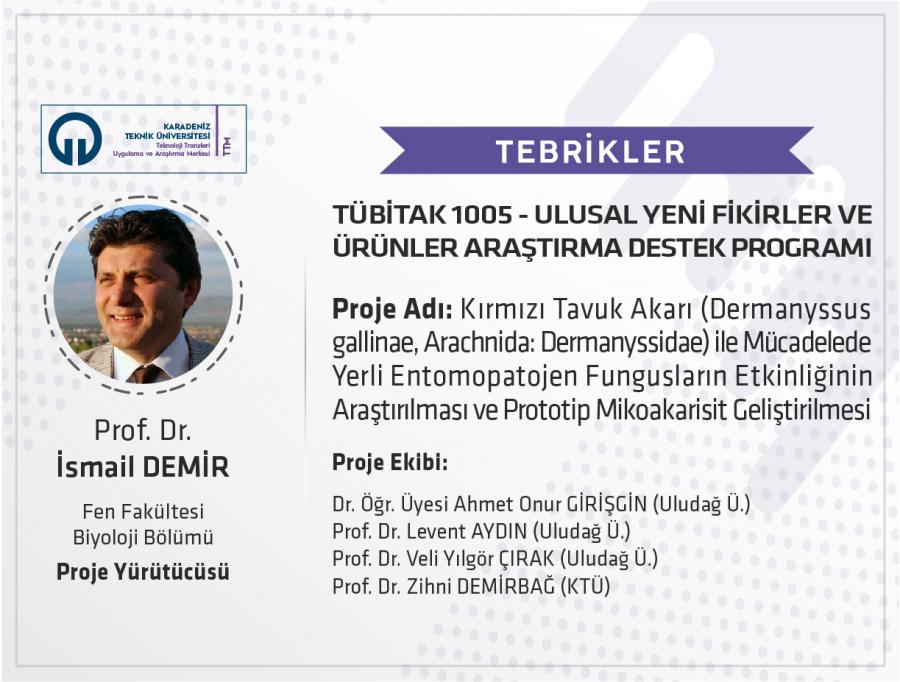 Üniversitemiz Fen Fakültesi Biyoloji Bölümü Öğretim Üyelerinden Prof. Dr. İsmail DEMİR'in, "Kırmızı Tavuk Akarı (Dermanyssusgallinae, Arachnida: Dermanyssidae) ile Mücadelede Yerli EntomopatojenFungusların Etkinliğinin Araştırılması ve Prototip Mikoakarisit Geliştirilmesi" başlıklı projesi, TÜBİTAK 1005 Ulusal Yeni Fikirler ve Ürünler Araştırma Destek Programı kapsamında desteklenmiştir.