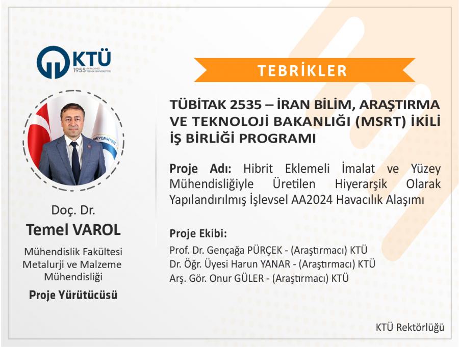 Üniversitemiz Mühendislik Fakültesi Metalurji ve Malzeme Mühendisliği Bölümü öğretim üyesi Doç. Dr. Temel VAROL’un "Hibrit Eklemeli İmalat ve Yüzey Mühendisliğiyle Üretilen Hiyerarşik Olarak Yapılandırılmış İşlevsel AA2024 Havacılık Alaşımı" başlıklı projesi “TÜBİTAK 2535 – İran Bilim, Araştırma ve Teknoloji Bakanlığı (MSRT) İkili İş Birliği Programı” kapsamında desteklenmiştir.
