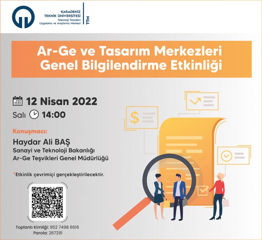 Sanayi ve Teknoloji Bakanlığı Ar-Ge Teşvikleri Genel Müdürlüğü'nden Haydar Ali BAŞ tarafından 12 Nisan 2022 Salı günü saat:14.00'de "Ar-Ge ve Tasarım Merkezi Kurulma Koşulları, Temel Gereklilikler ve Sağladığı Avantajlar" konulu bilgilendirme toplantısı çevrimiçi olarak gerçekleştirilecektir.